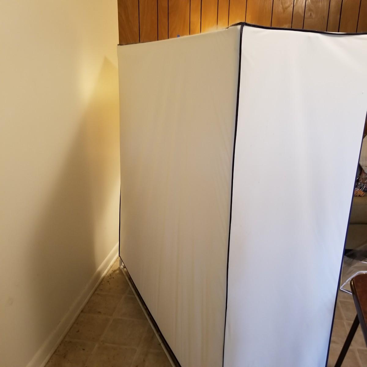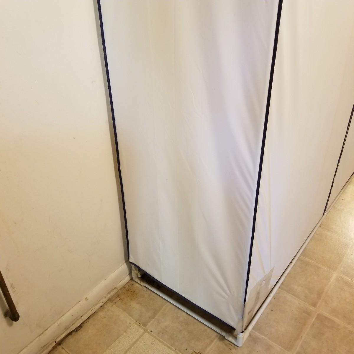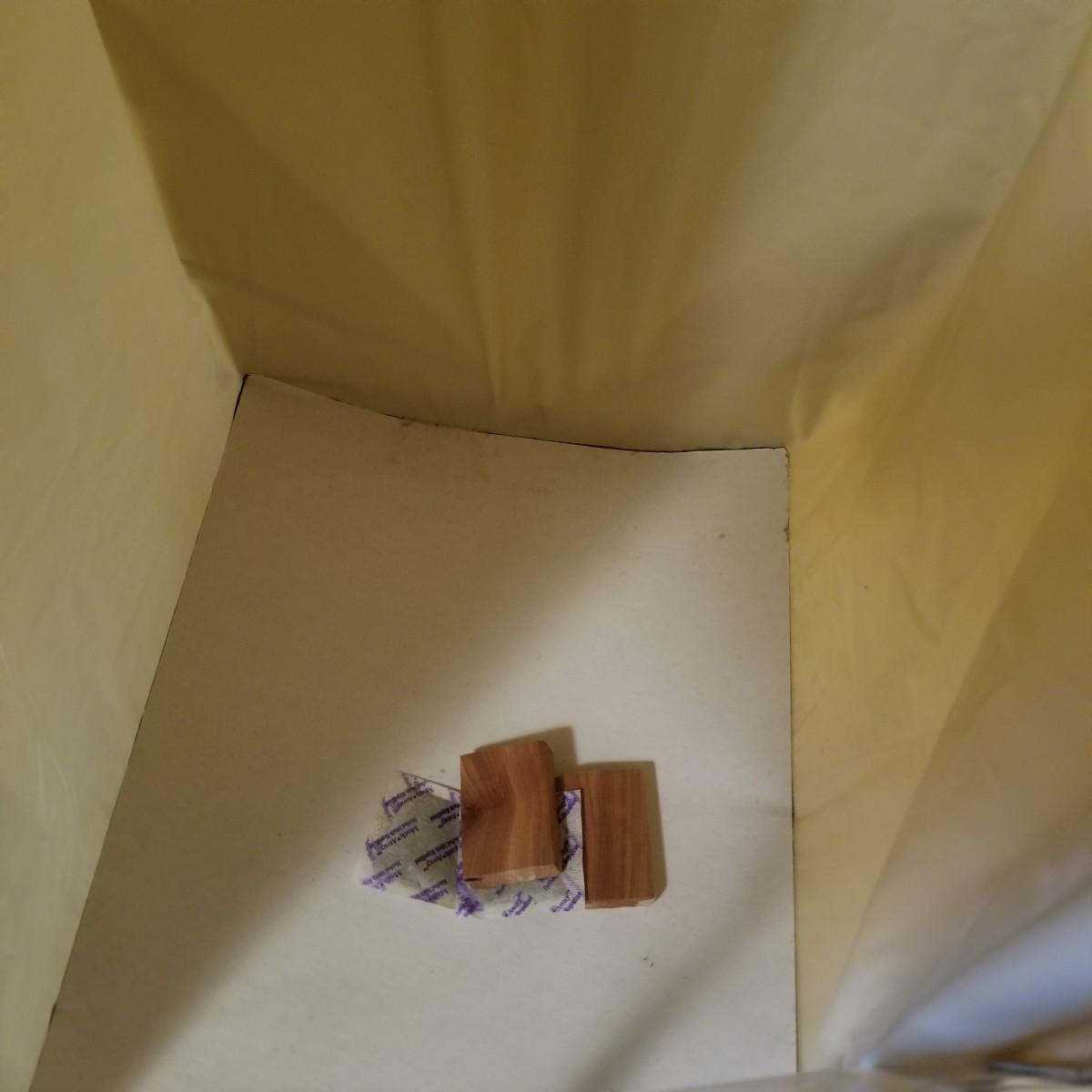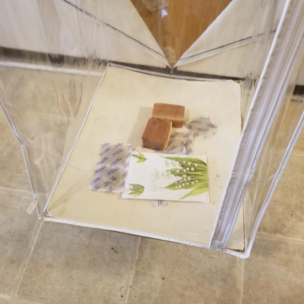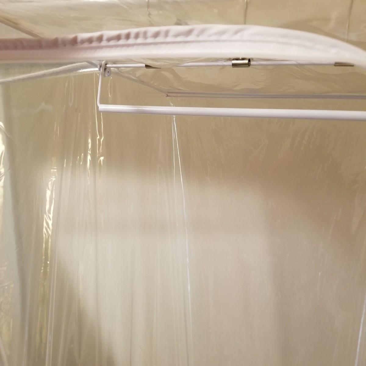 One standalone and three hanging style garment bags. Large piece is on PVC frame and has three way zipper opening. It measures 60" x 21" x 61". The three other bags have inside hanging bars and triple hooks on top for closet or other space. Brown bag is 14" x 20" x 53", green bag is 14" x 20" x 56", clear bag is 15" x 20" x 54". Standalone bag has small tear in lower corner, has been taped. Note that three smaller bags will fit inside the larger one. See photos for details. Some small cedar block and desiccants are included.