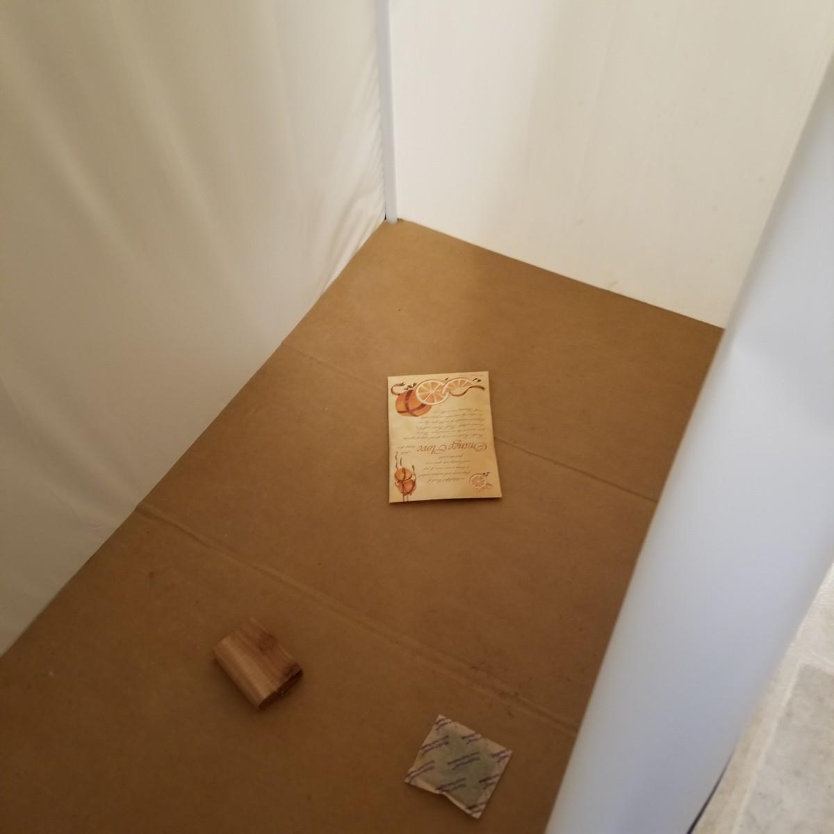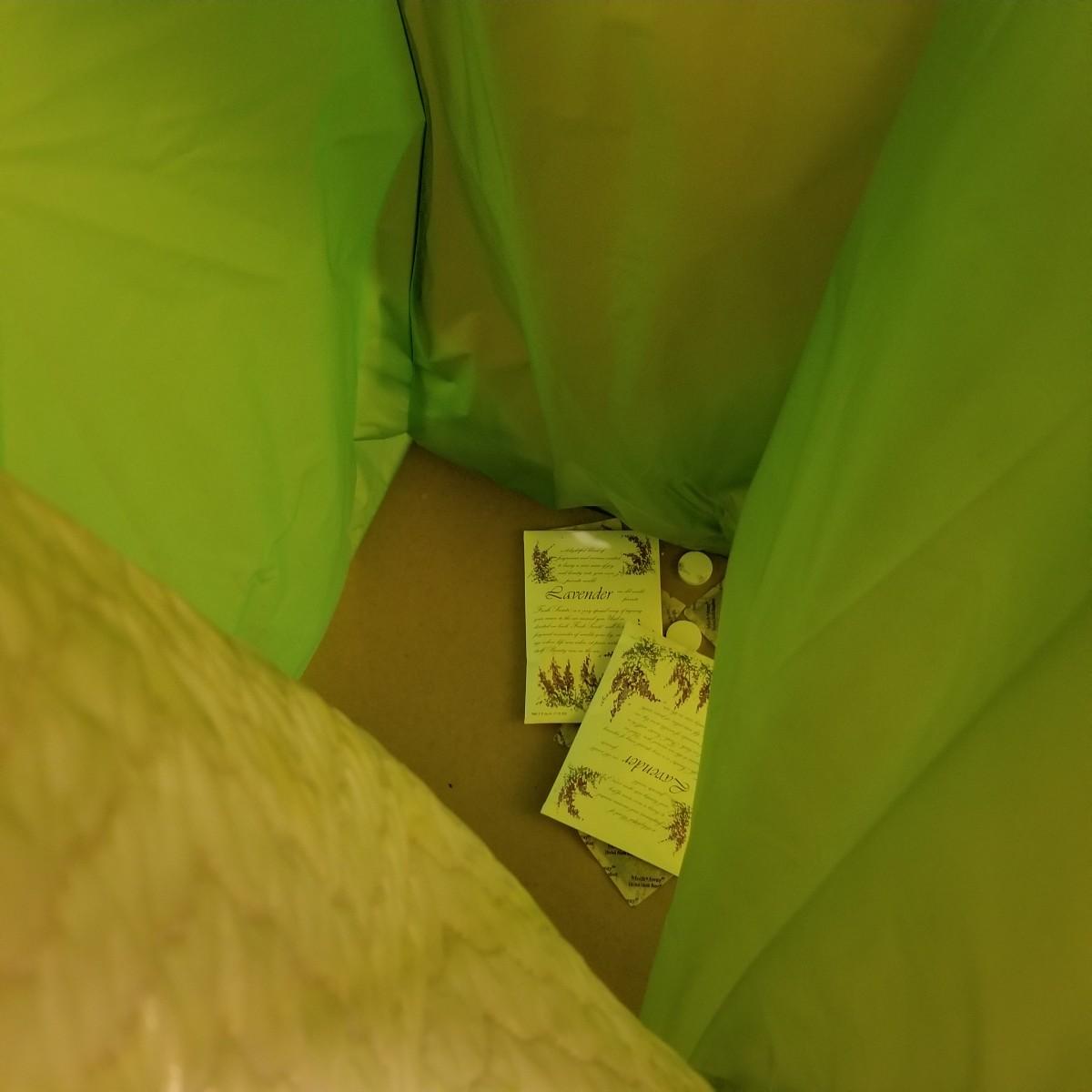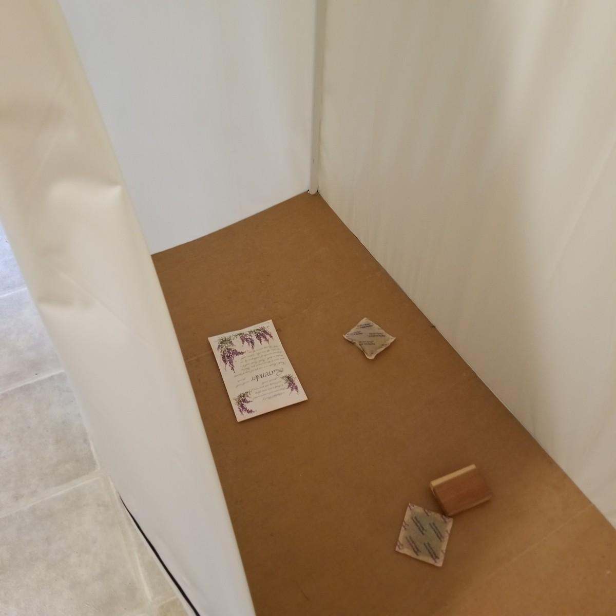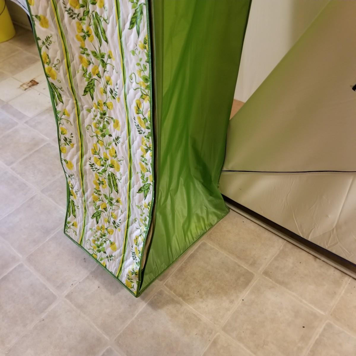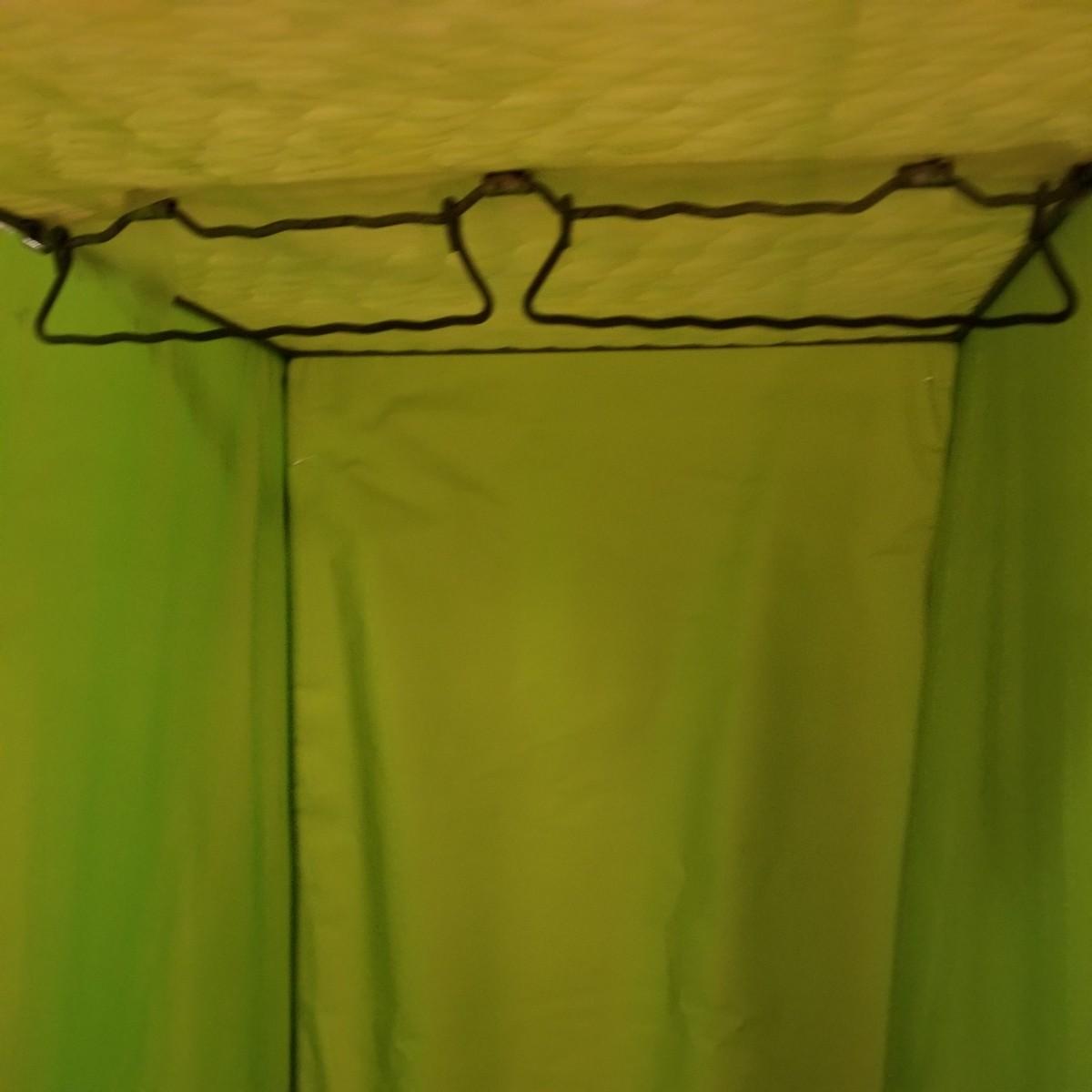 One standalone and three hanging style garment bags. Large piece is on PVC frame and has three way zipper opening. It measures 60" x 21" x 61". The three other bags have inside hanging bars and triple hooks on top for closet or other space. Brown bag is 14" x 20" x 53", green bag is 14" x 20" x 56", clear bag is 15" x 20" x 54". Standalone bag has small tear in lower corner, has been taped. Note that three smaller bags will fit inside the larger one. See photos for details. Some small cedar block and desiccants are included.