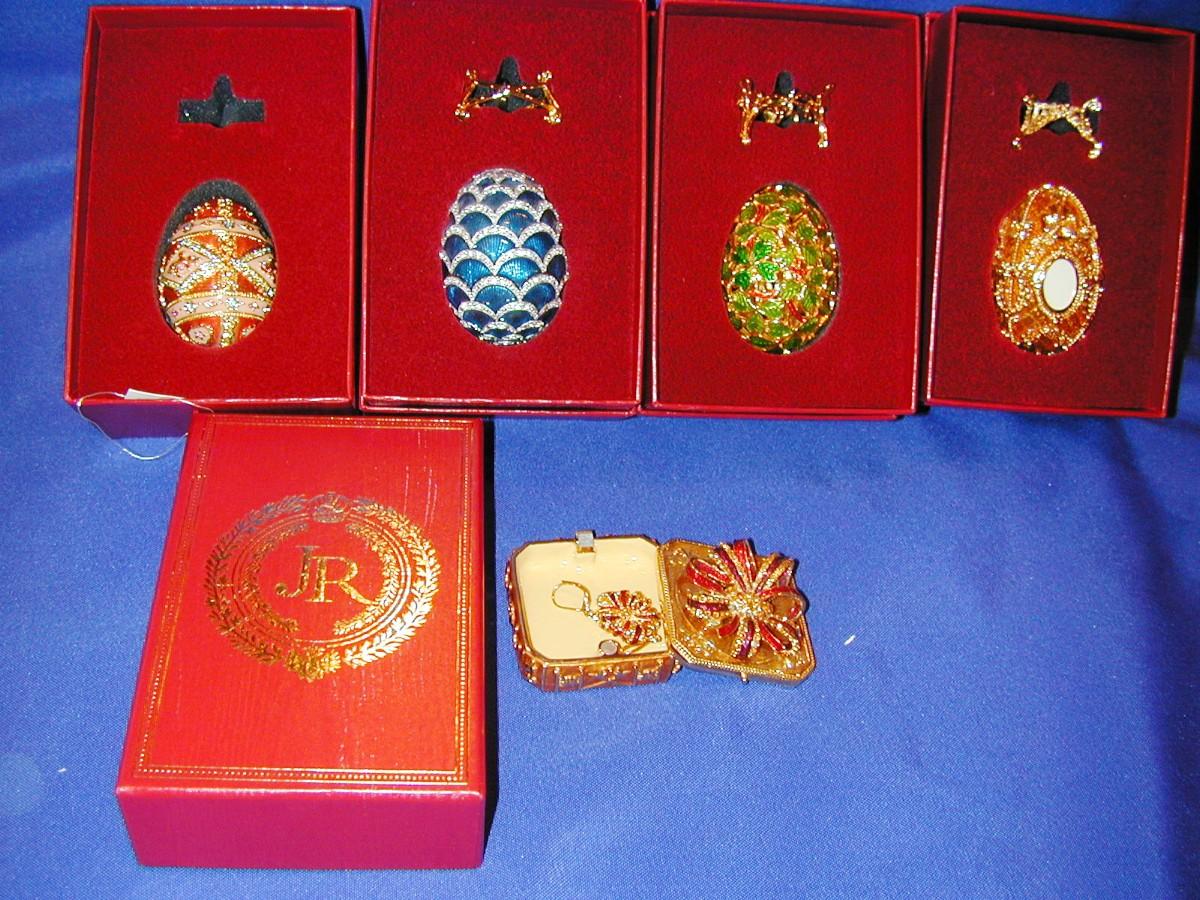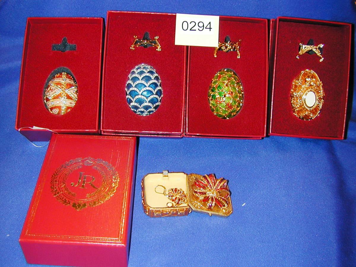 4 Joan Rivers Jeweled Enamel Imperial Treasures Eggs (Missing 1 Stand) + 1 Enamel Box With Earrings Lot 294