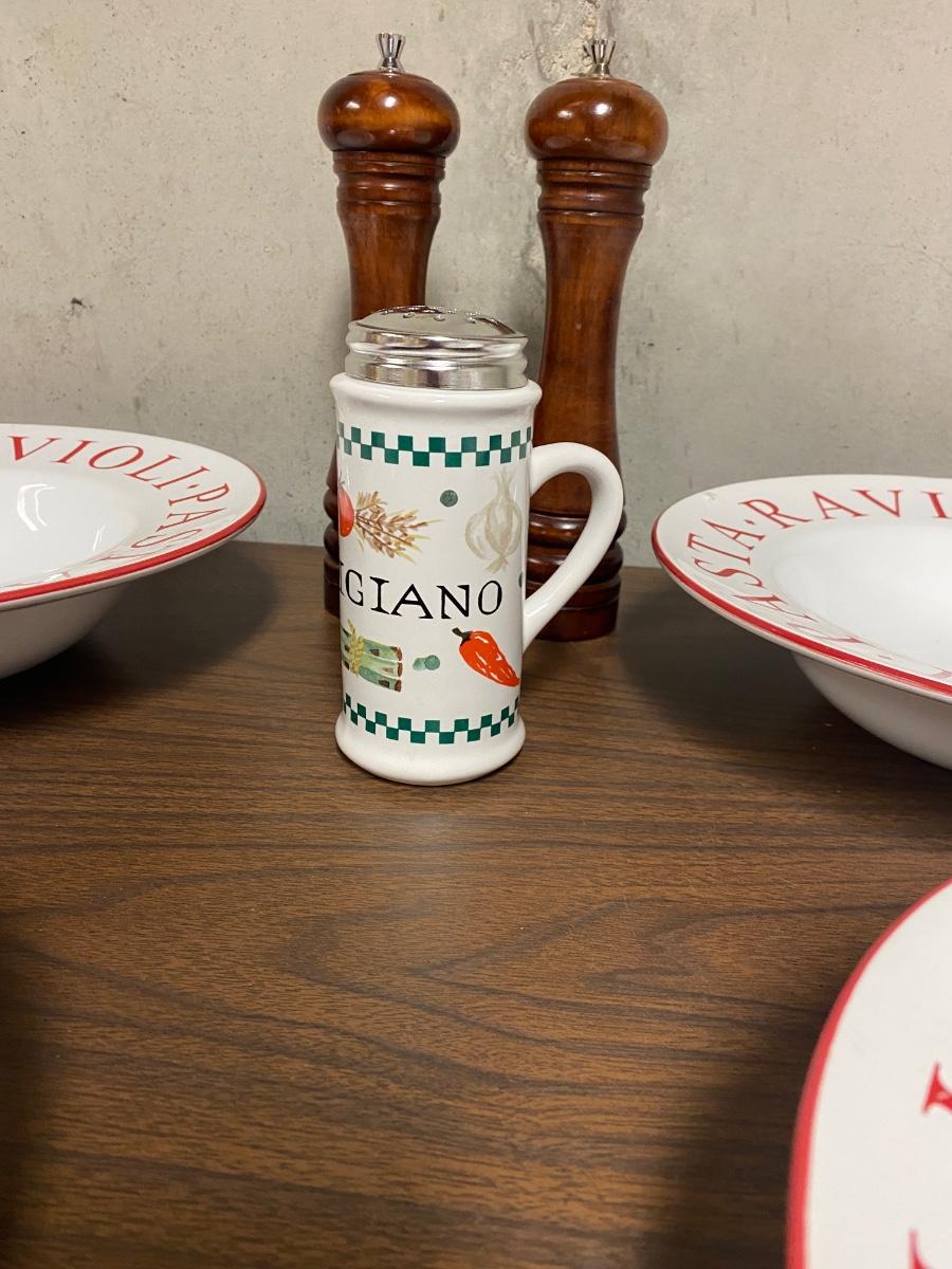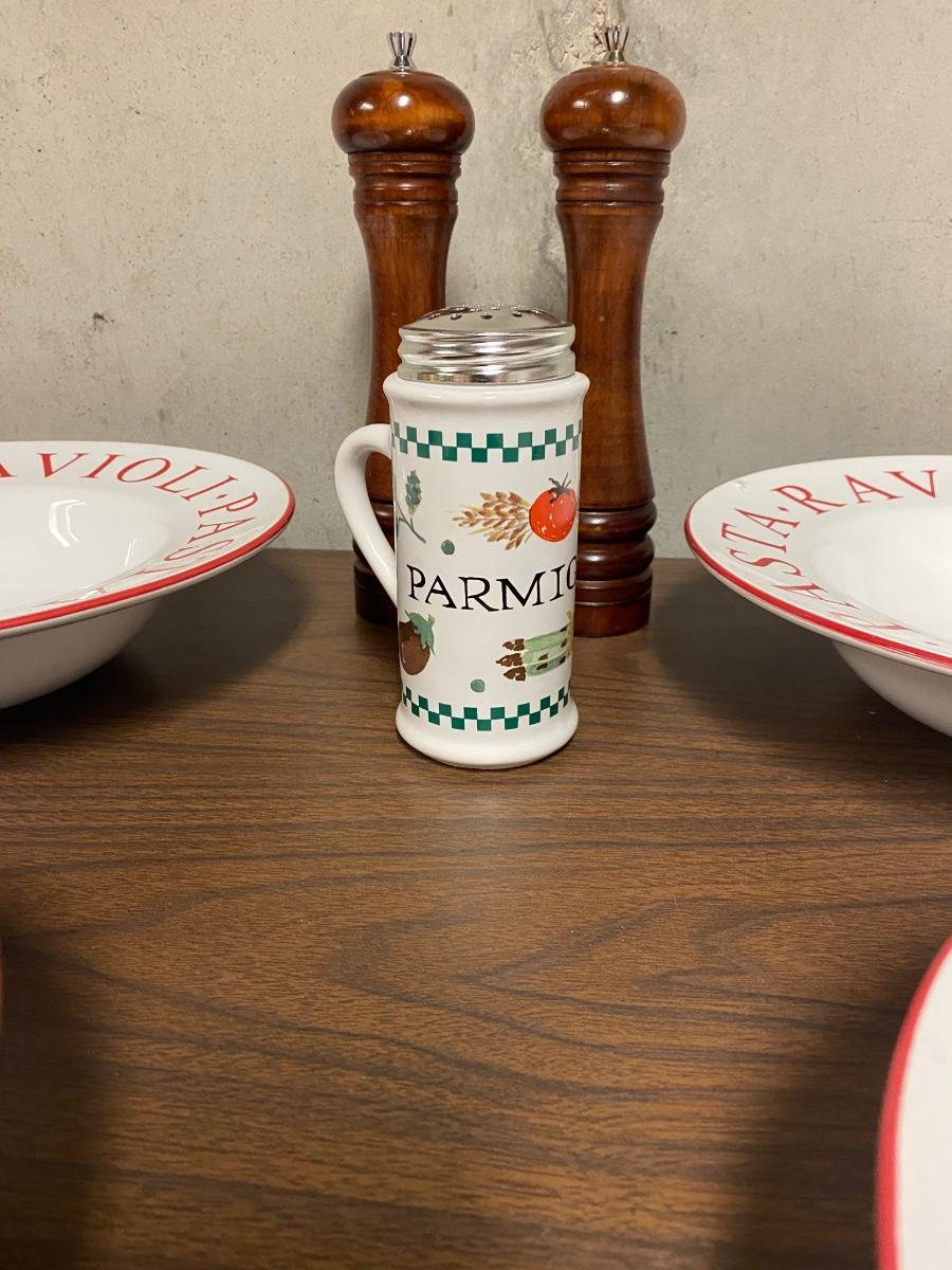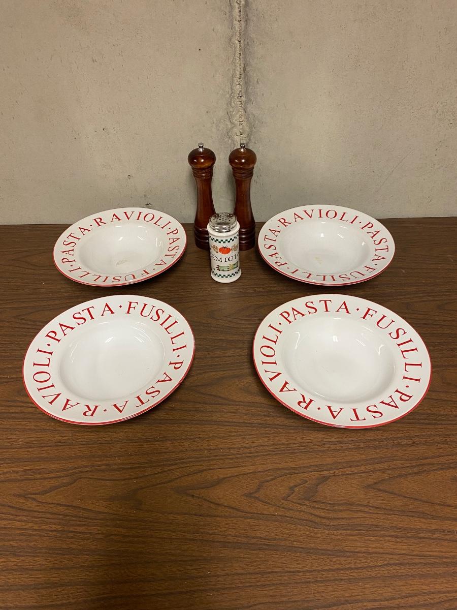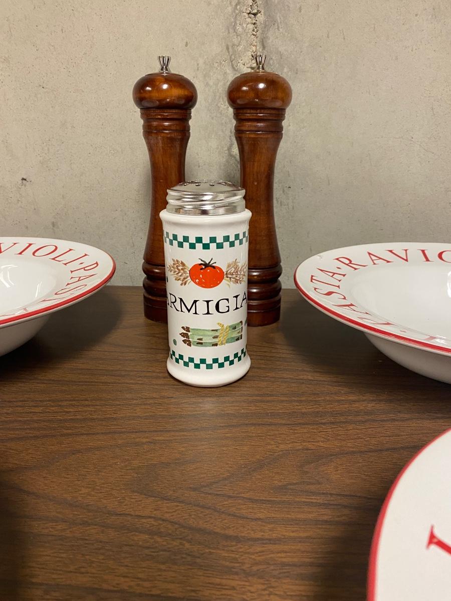 4 LARGE (11”) PASTA BOWLS, PEPPER GRINDER AND PARMESAN CHEESE SHAKER