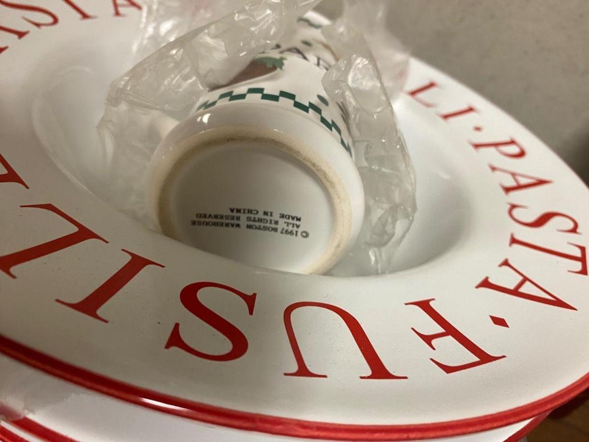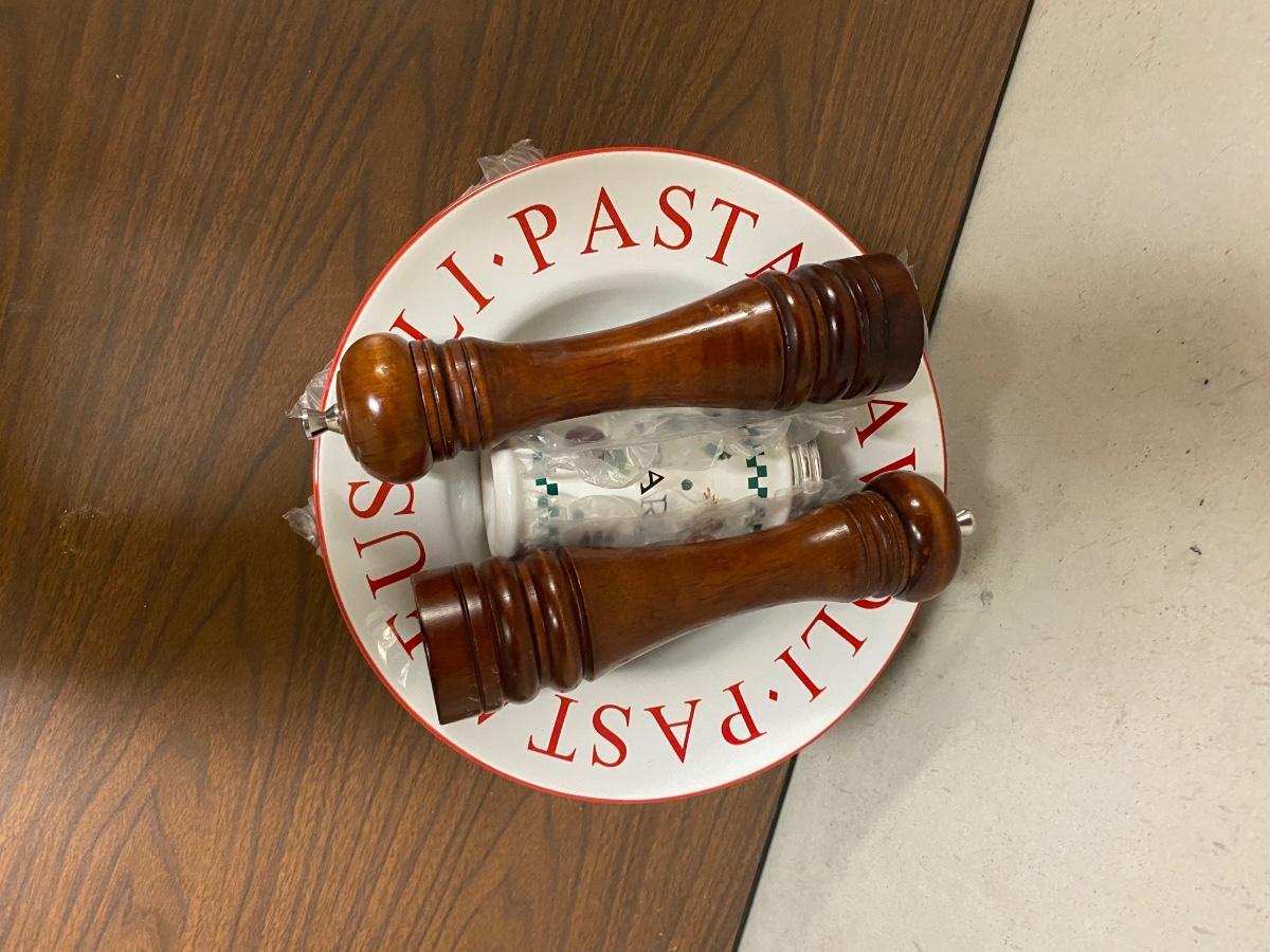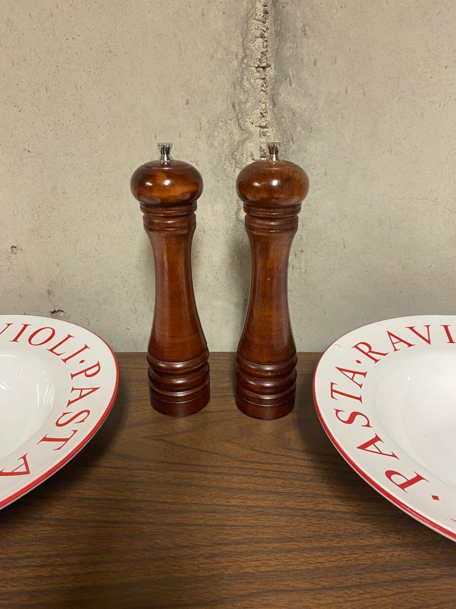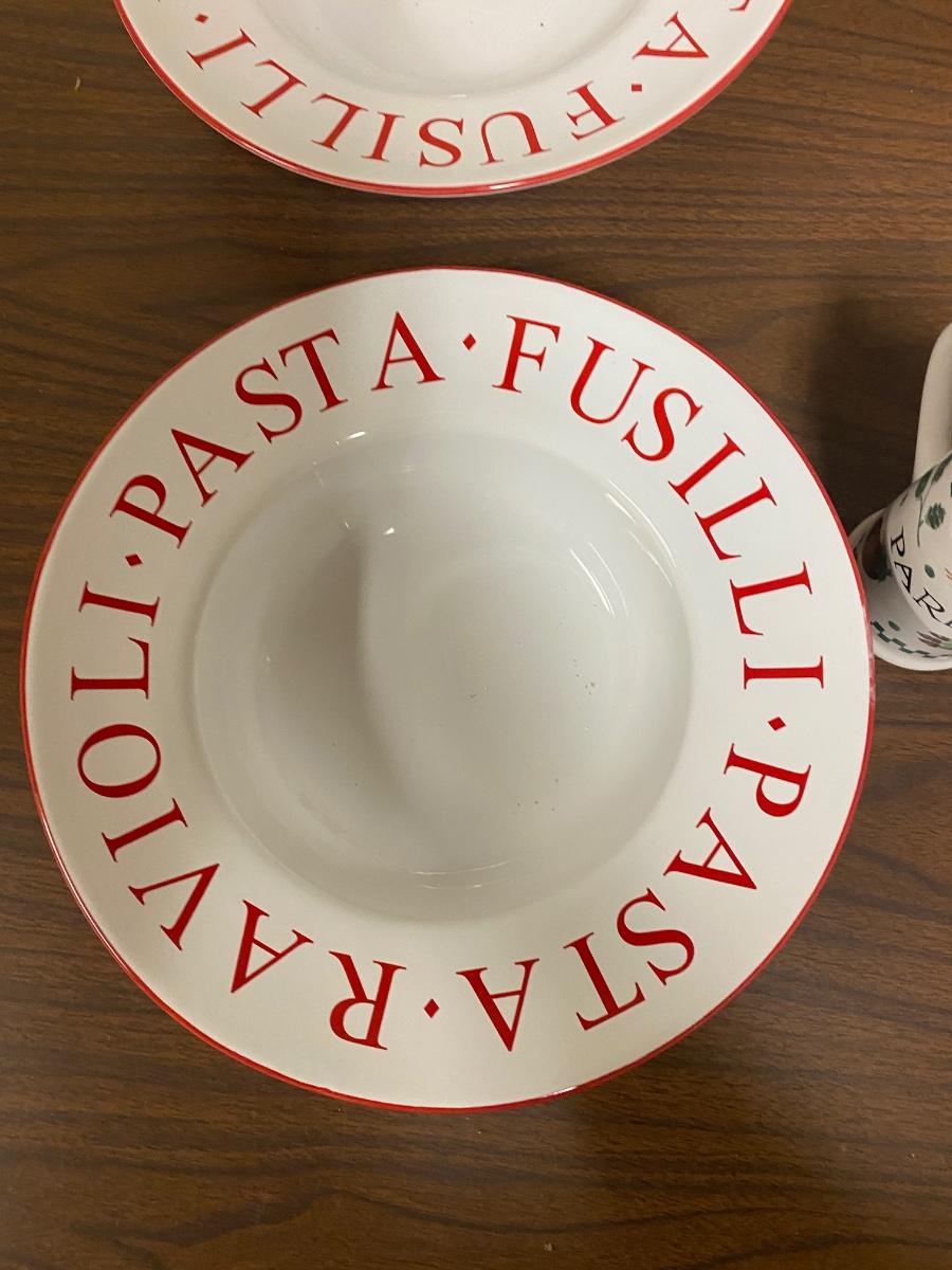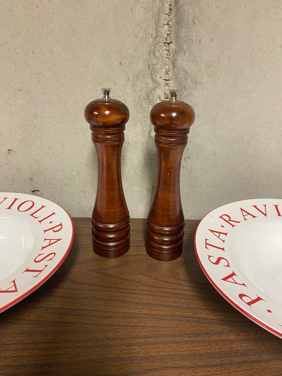 4 LARGE (11”) PASTA BOWLS, PEPPER GRINDER AND PARMESAN CHEESE SHAKER