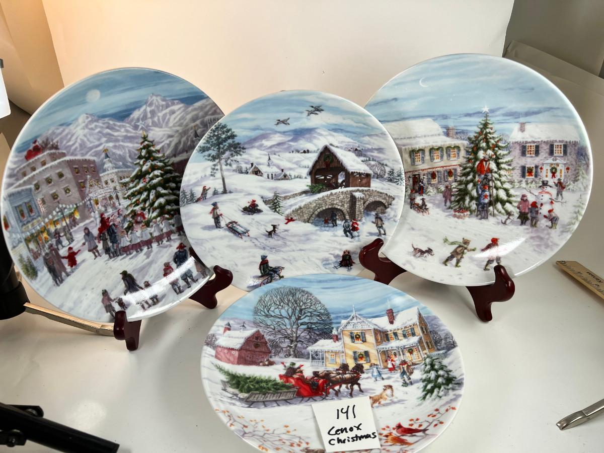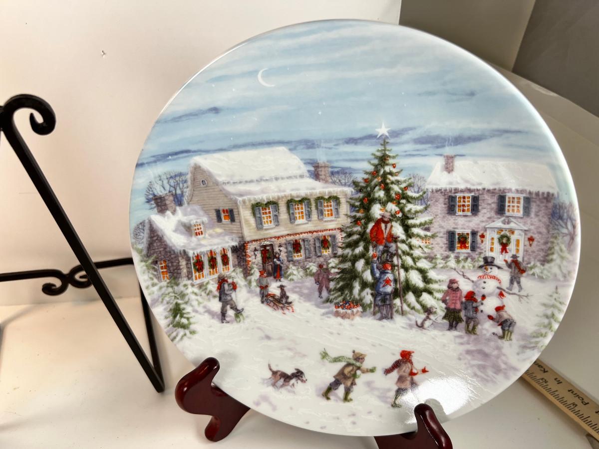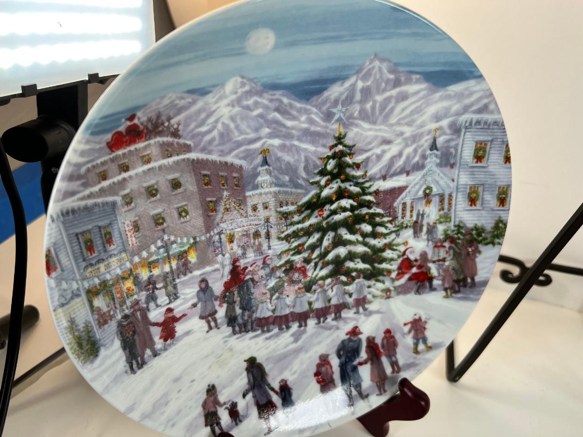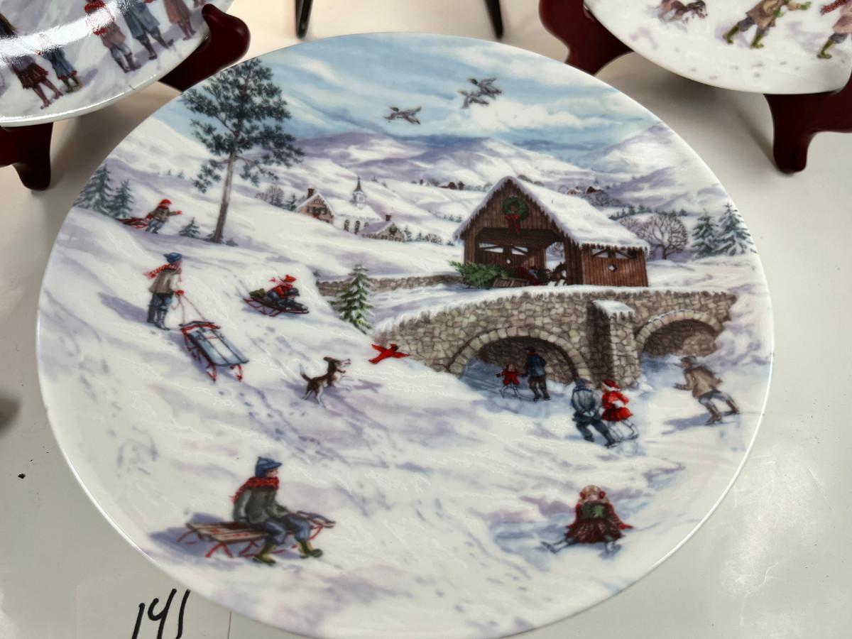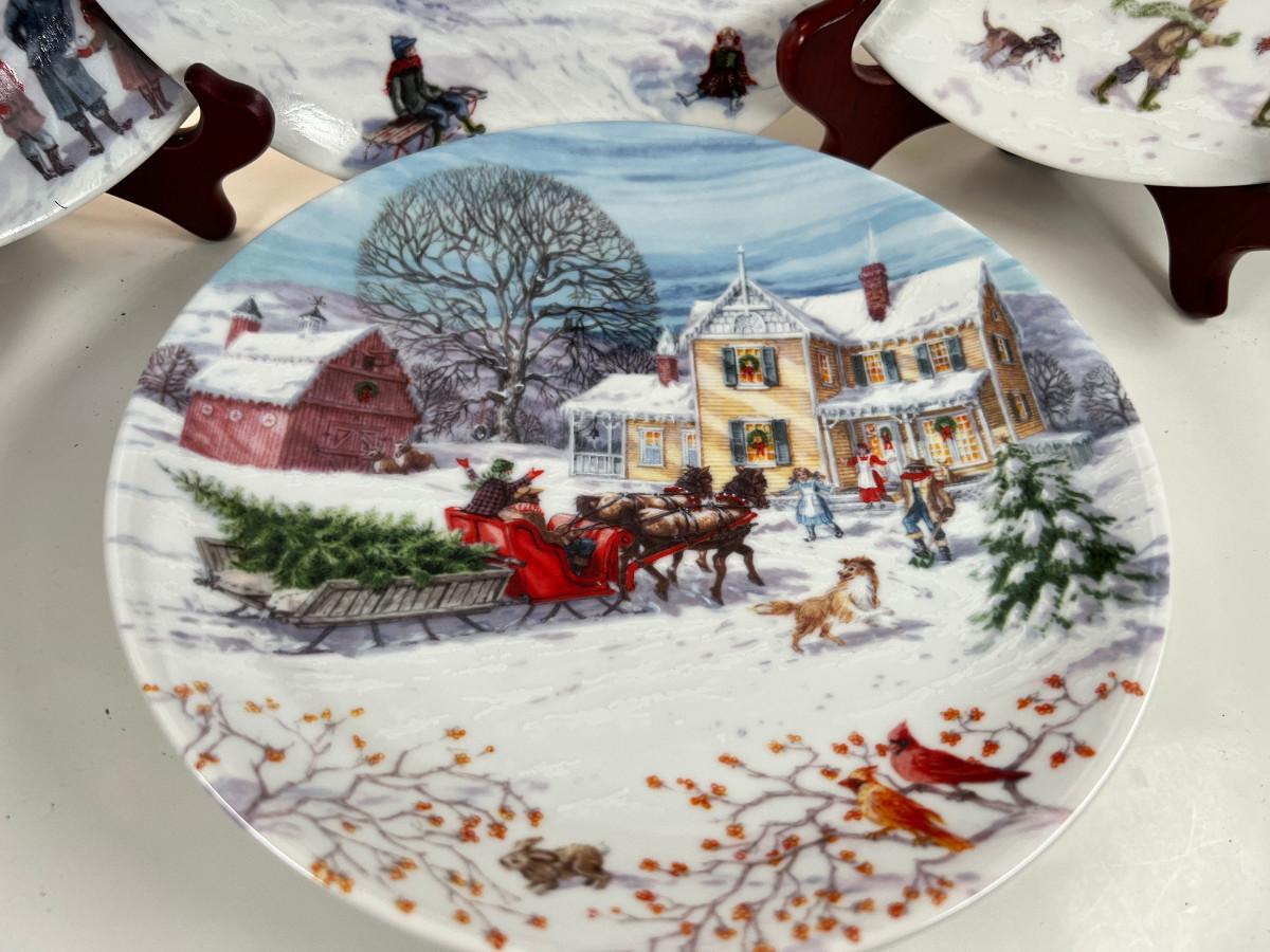 American Christmas Winter scenes, the Skating pond, All the trimmings, bringing home the tree, and carols on main street. No boxes or wall hangers. Plates are in Mint condition