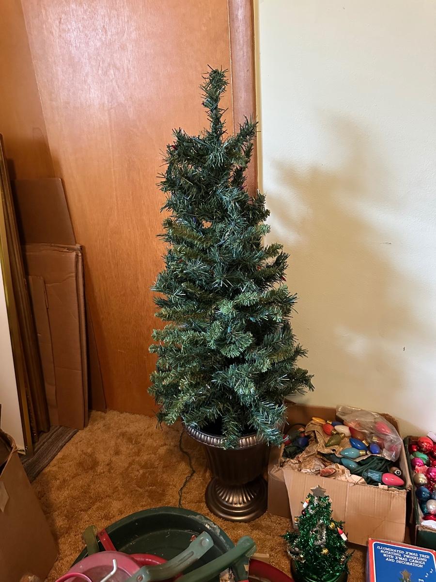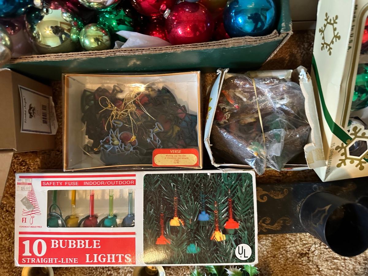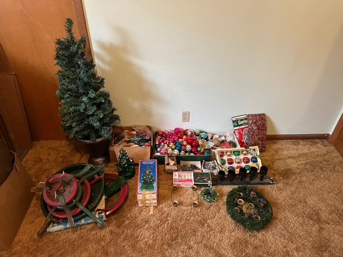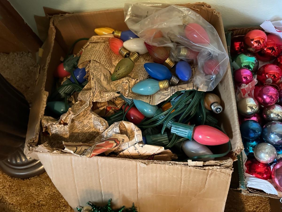 4’ LIGHTED CHRISTMAS TREE, VINTAGE LIGHTS, ORNAMENTS AND MUCH MORE