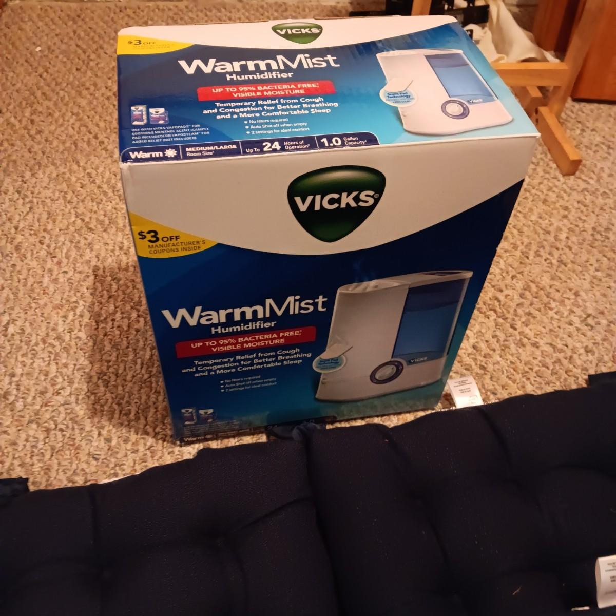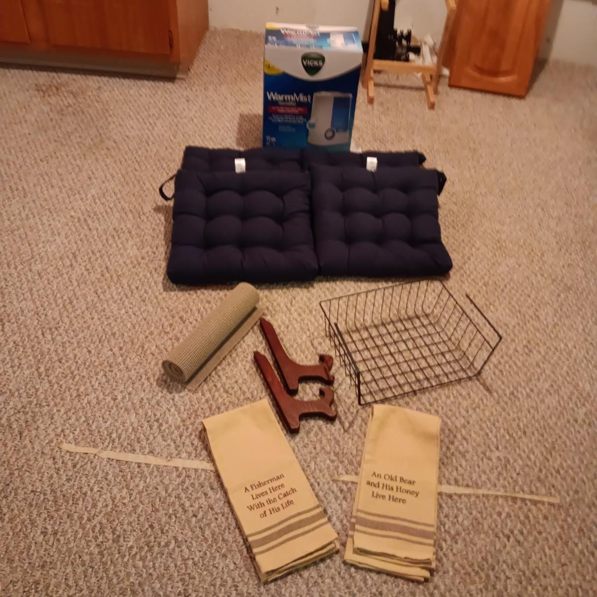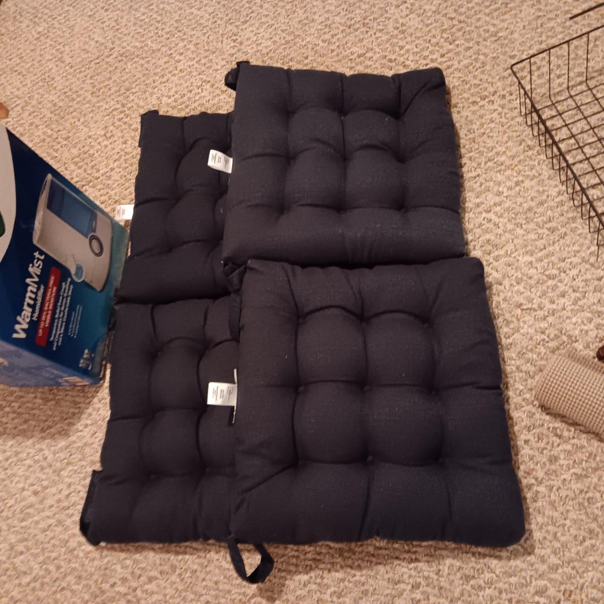4 LIKE NEW NAVY BLUE CHAIR CUSHIONS, HUMIDIFIER AND MORE