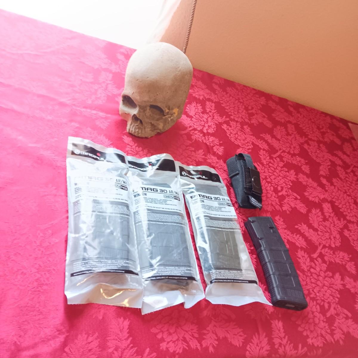 4 MAGPUL PMAG 30 AR/M4, HOLSTER AND A FOAM SKULL IN ROUGH SHAPE
