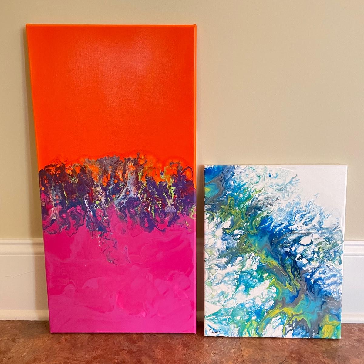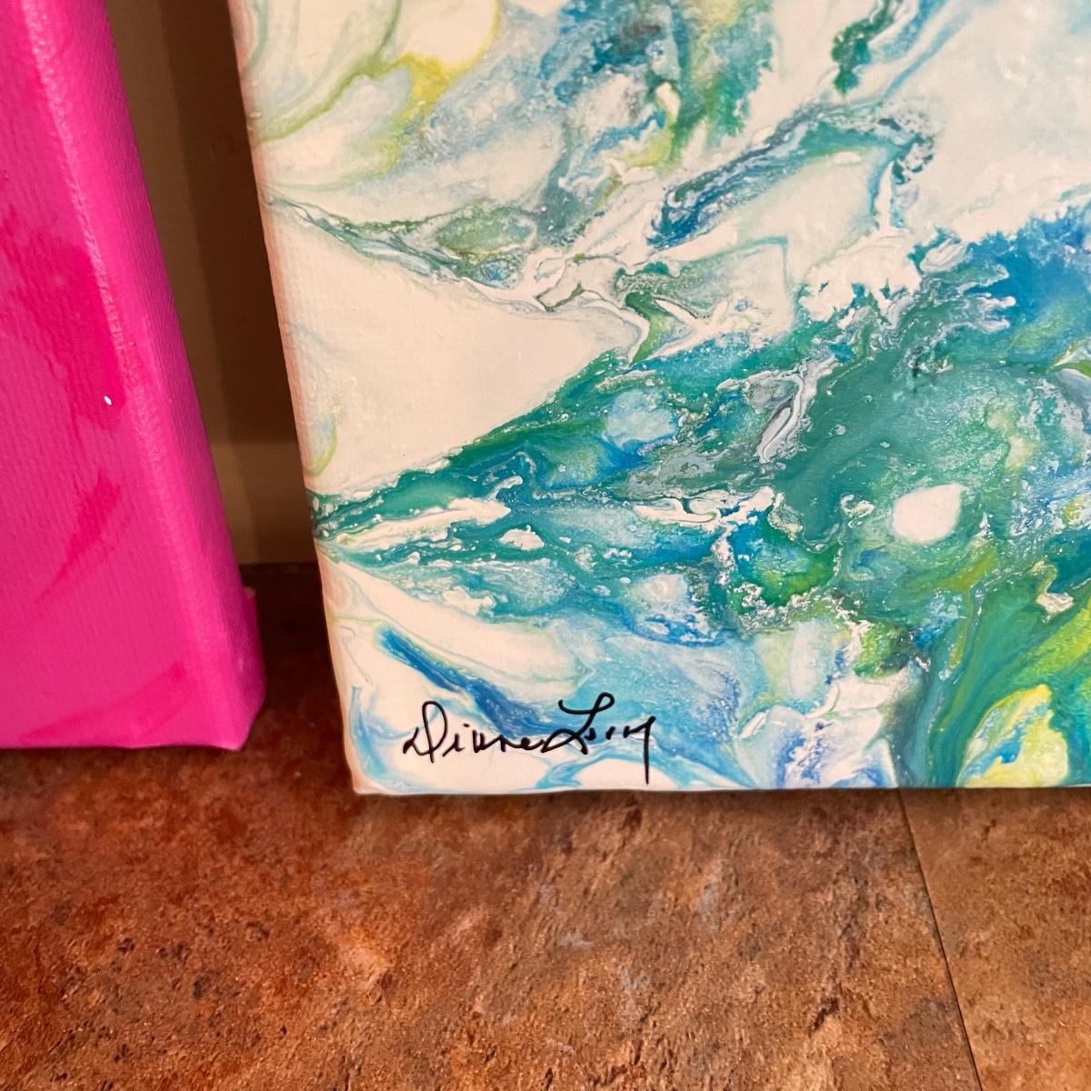 Four oil paintings featuring marbled abstract art. The largest is 12” x 24”, two medium pieces measure 14” x 11” and the smallest is 10”sq. Shipping available. Please call UPS with dimensions at 828-252-6930 for a shipping quote prior to bidding.