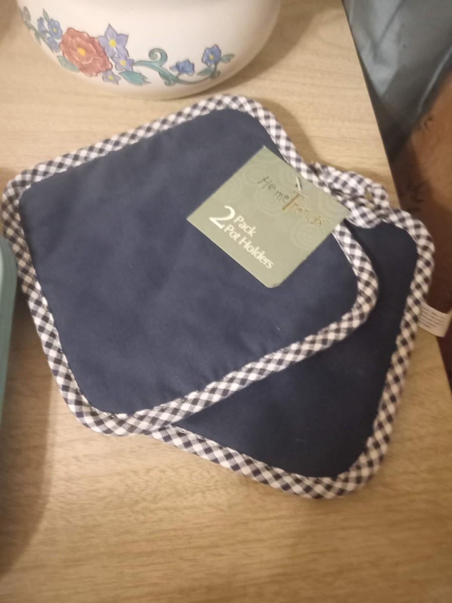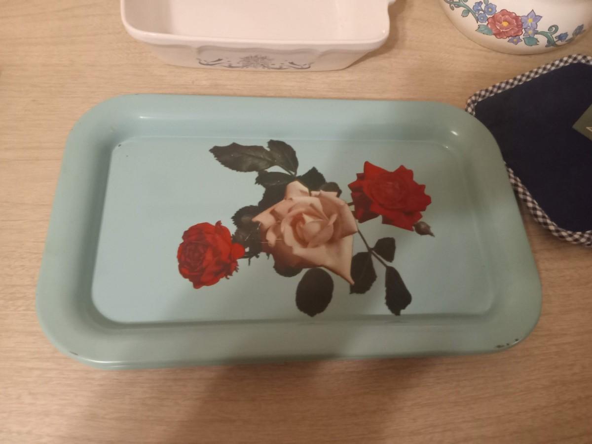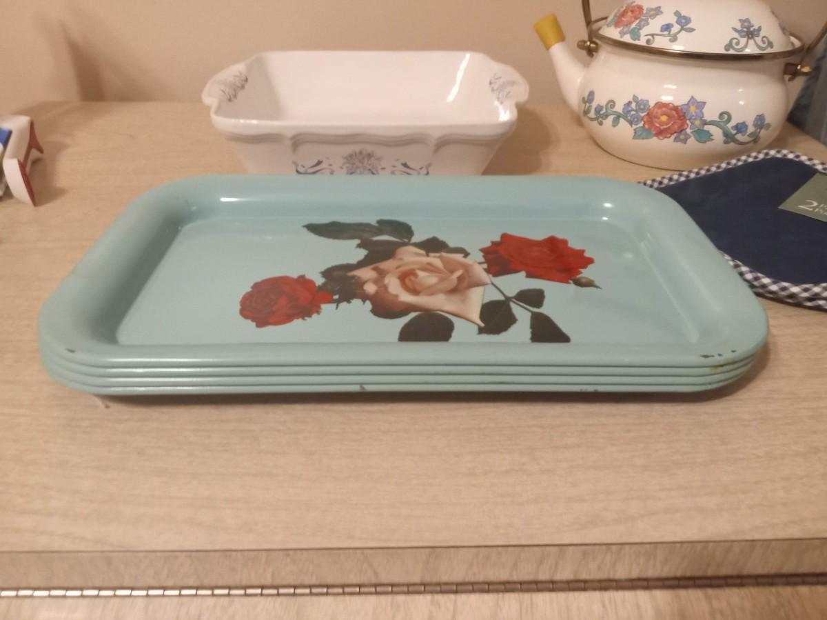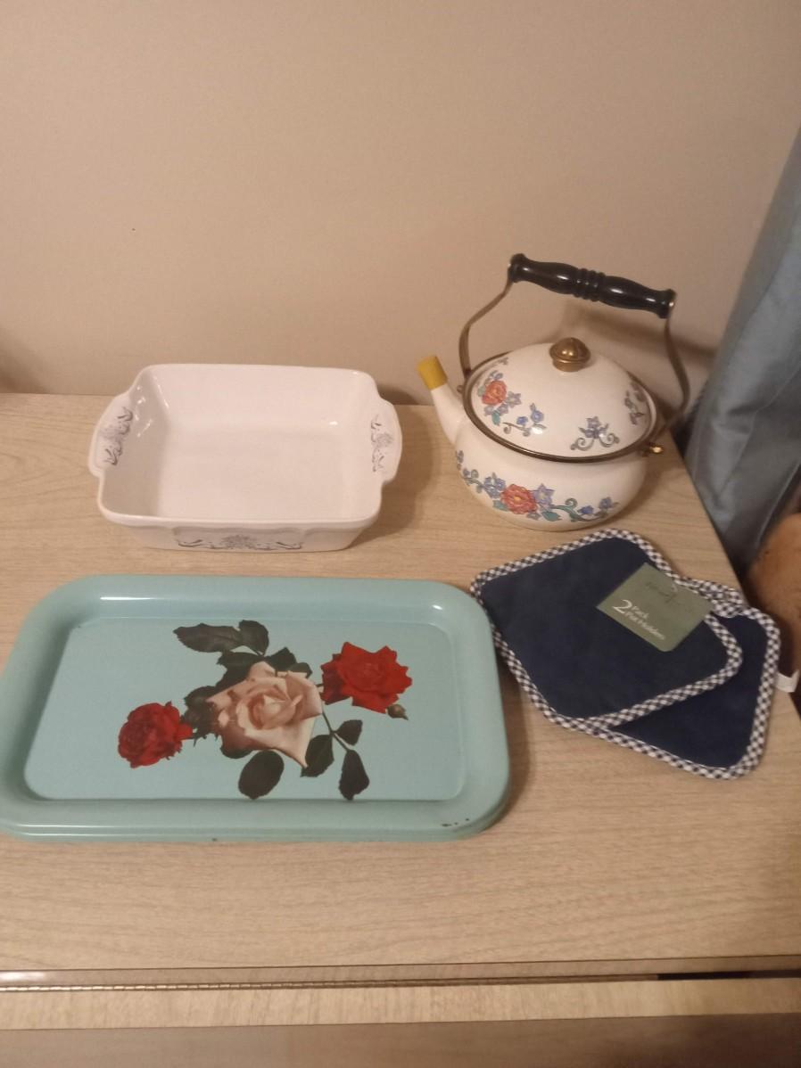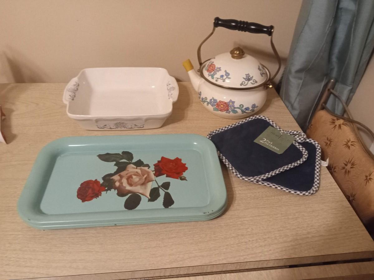 4 MATCHING TRAYS, ENAMEL TEA KETTLE, CASSEROLE DISH AND NEW POT HOLDERS
