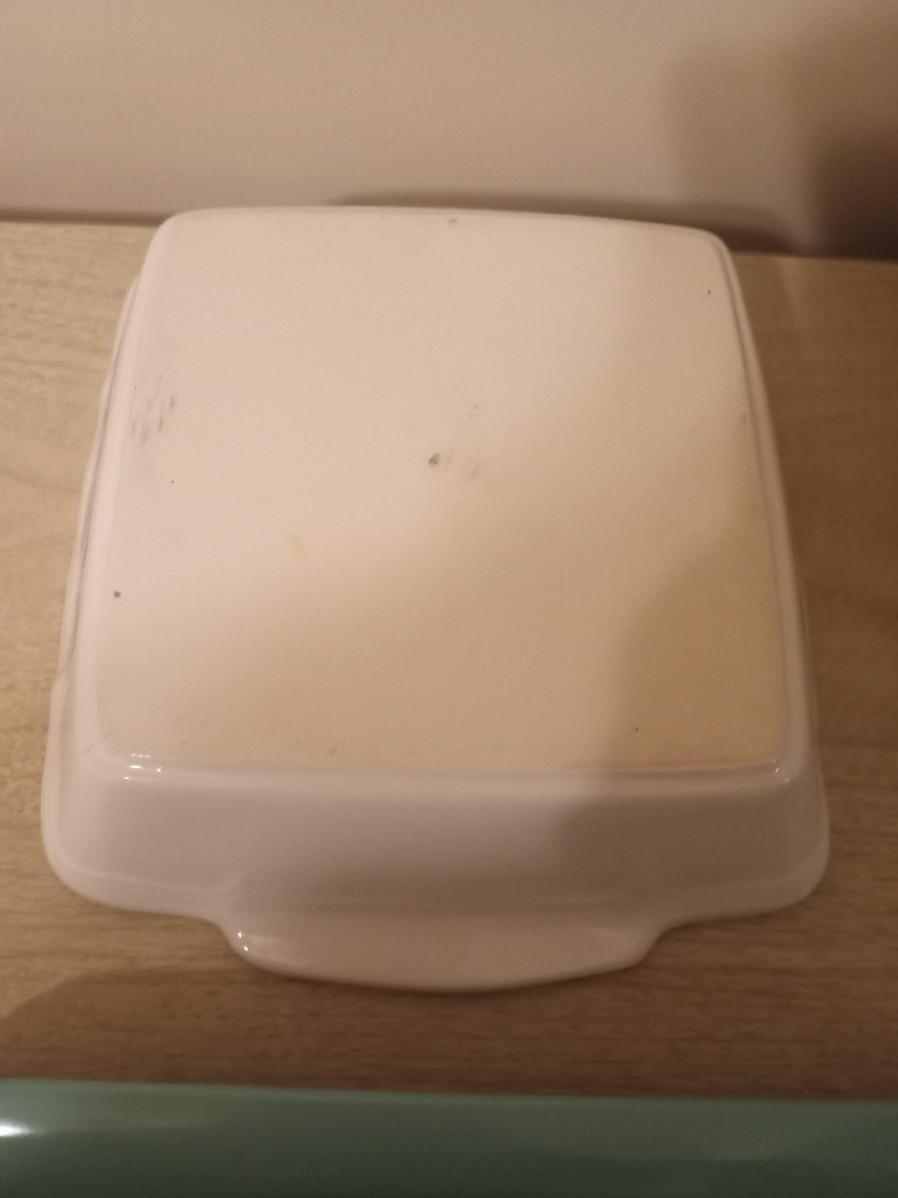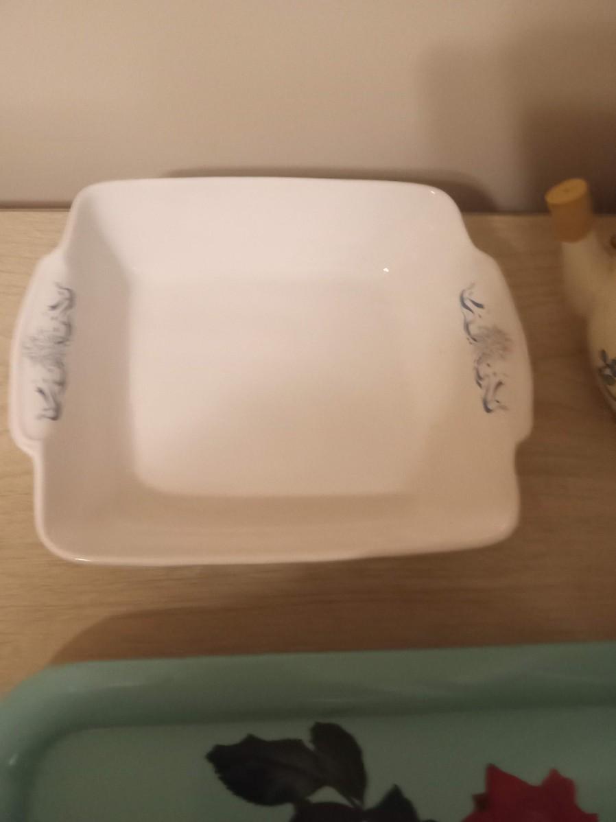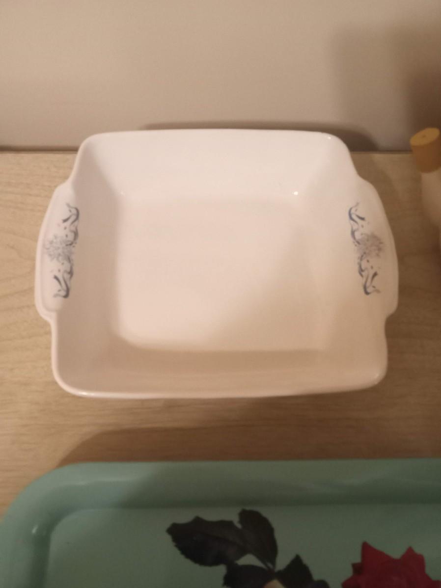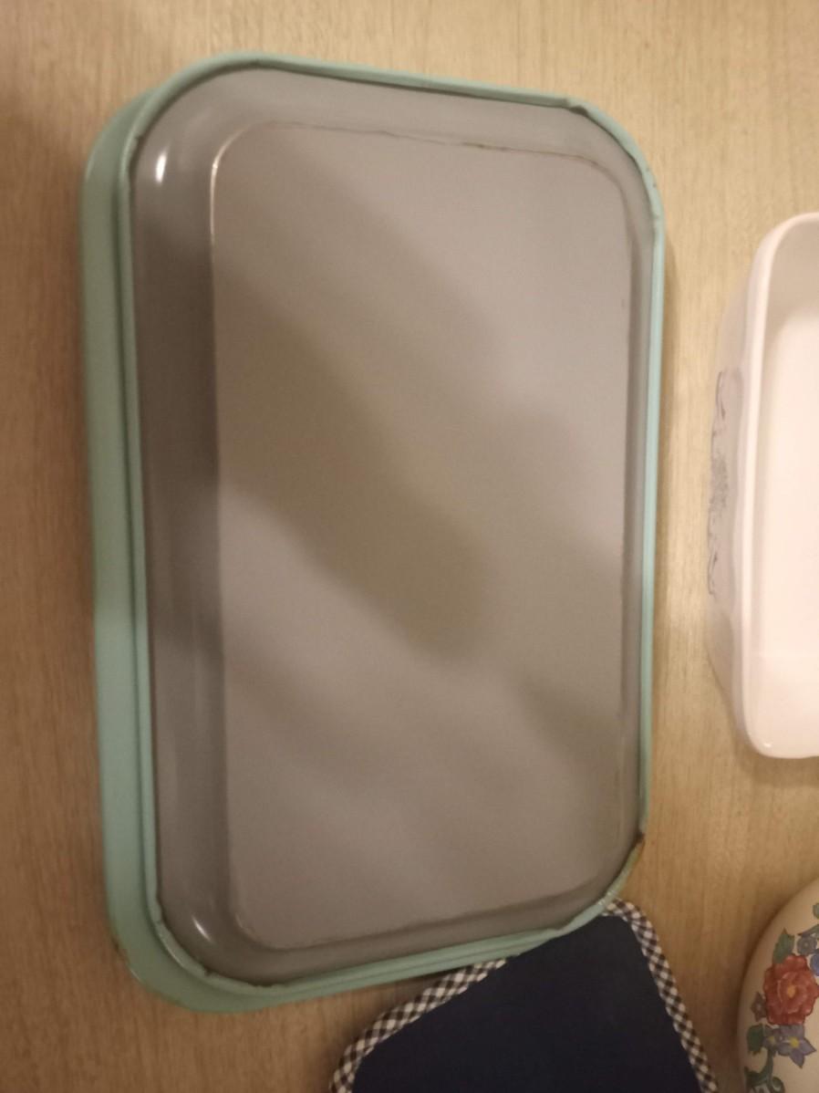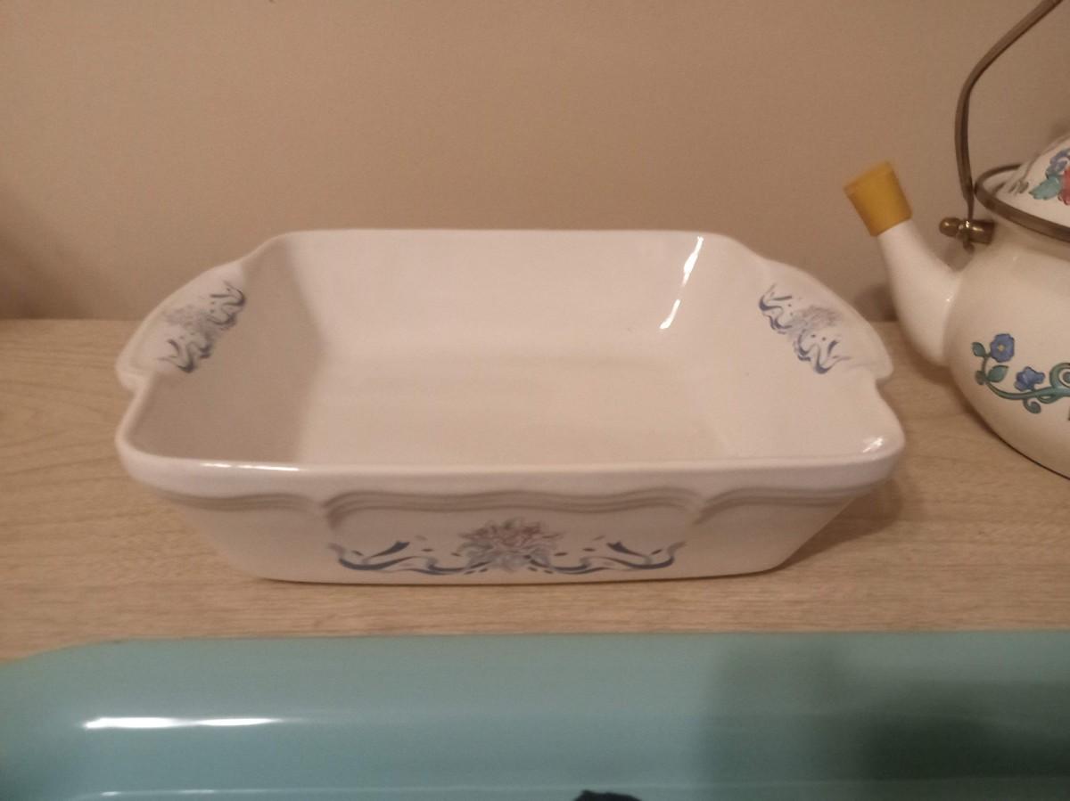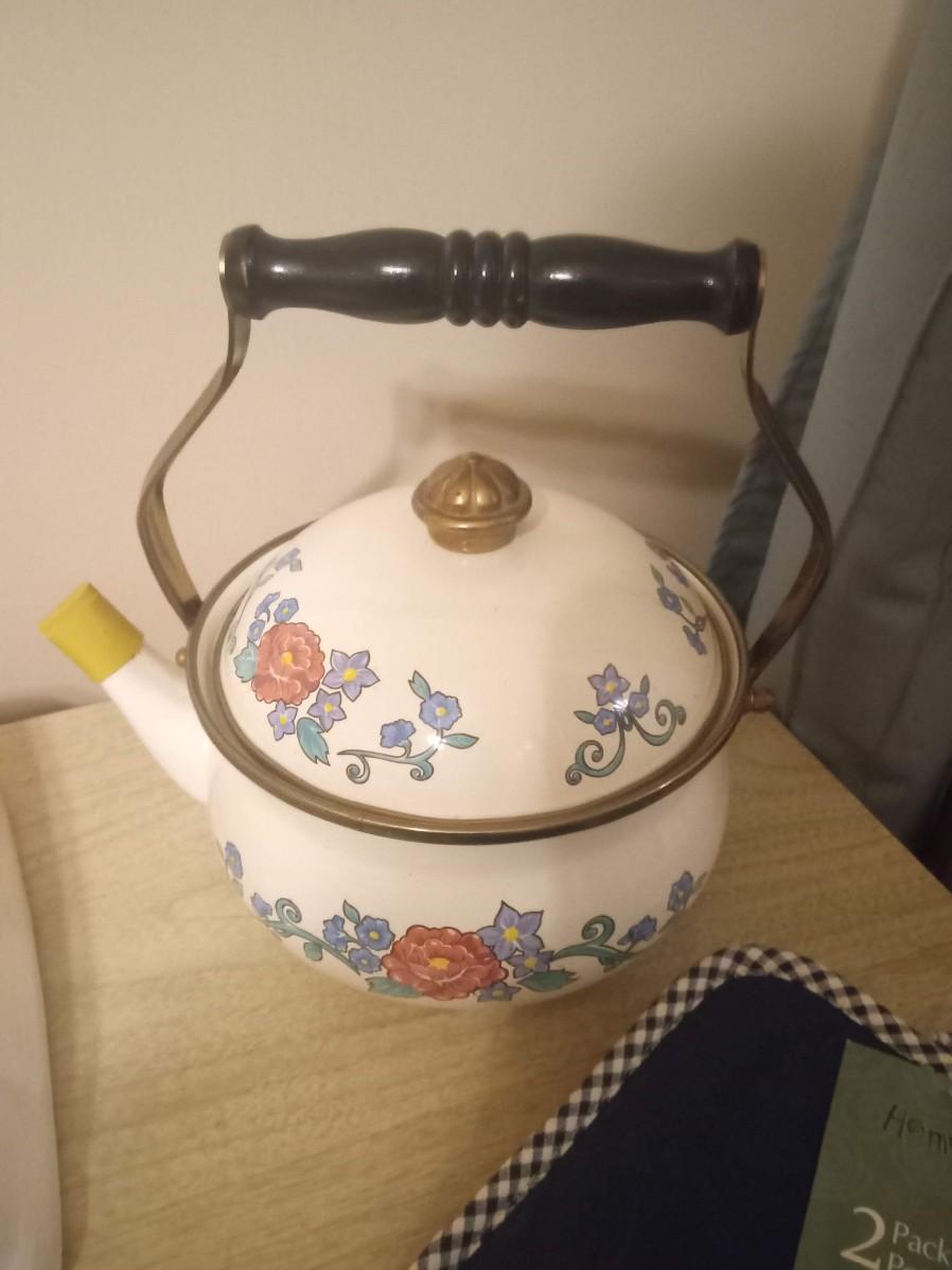 4 MATCHING TRAYS, ENAMEL TEA KETTLE, CASSEROLE DISH AND NEW POT HOLDERS
