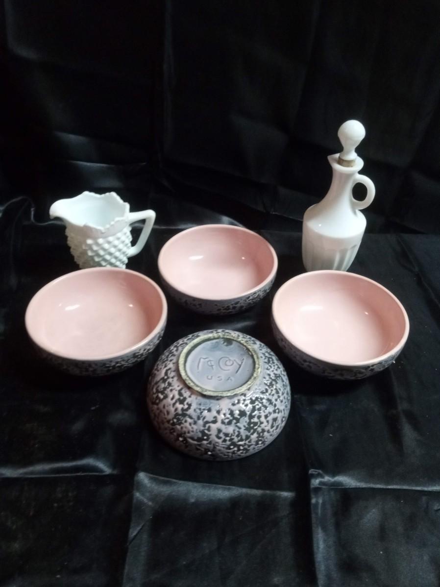 4 McCoy BOWLS, MILK GLASS CREAMER AND A CRUET