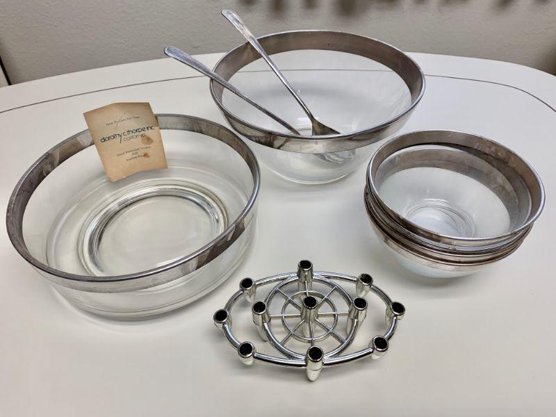 MId-century design elegance. Dorthy C. Thorpe crystal salad set rimmed with sterling silver.