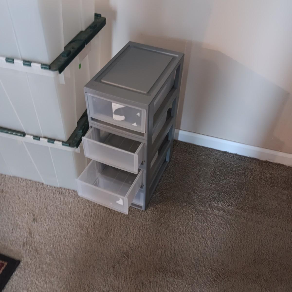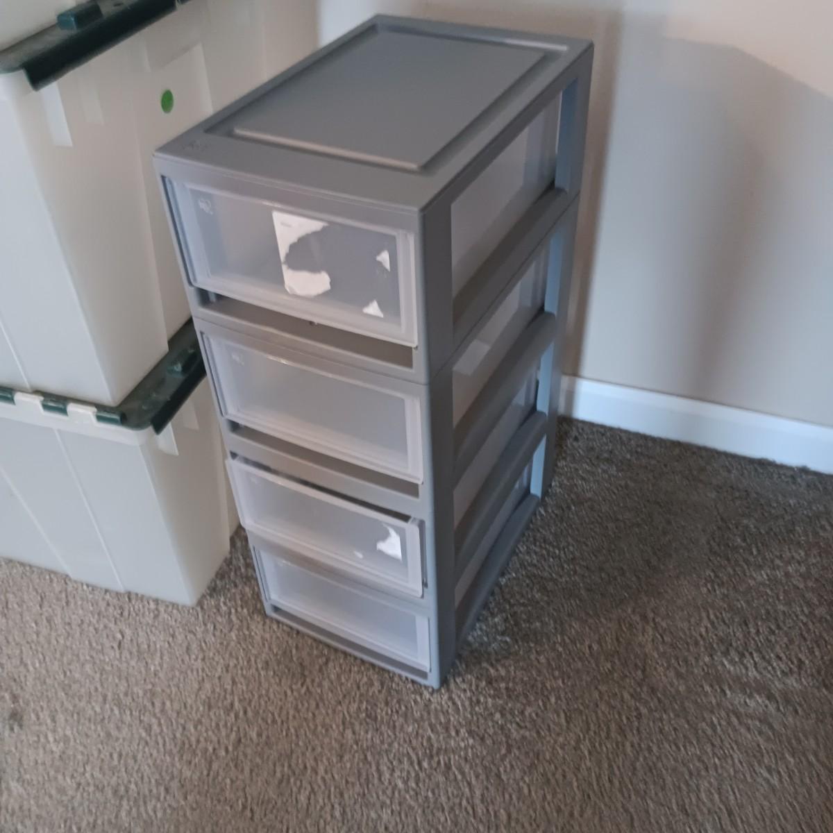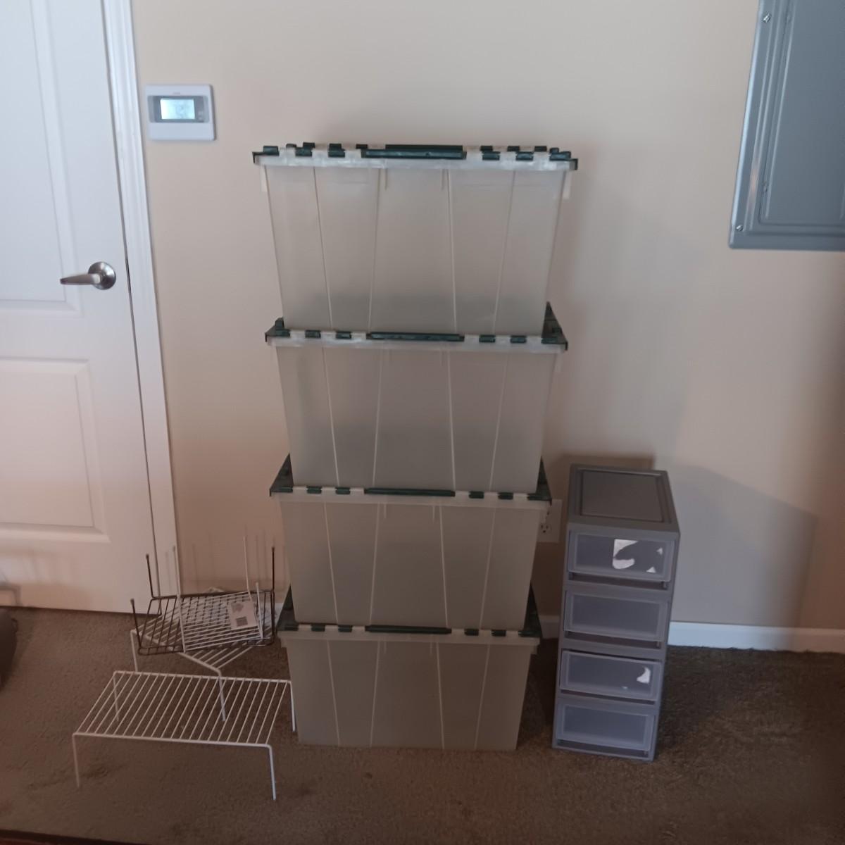 4 MEDIUM SIZE CLAM SHELL LID STORAGE TOTES, DRAWER ORGANIZER AND CUPBOARD LIFTS