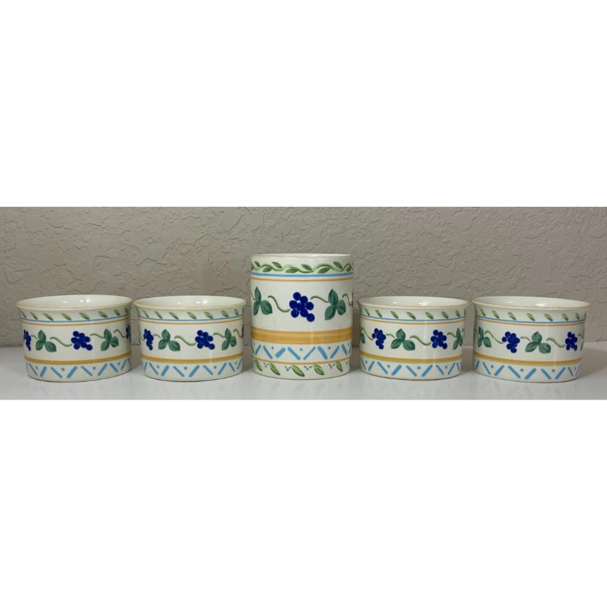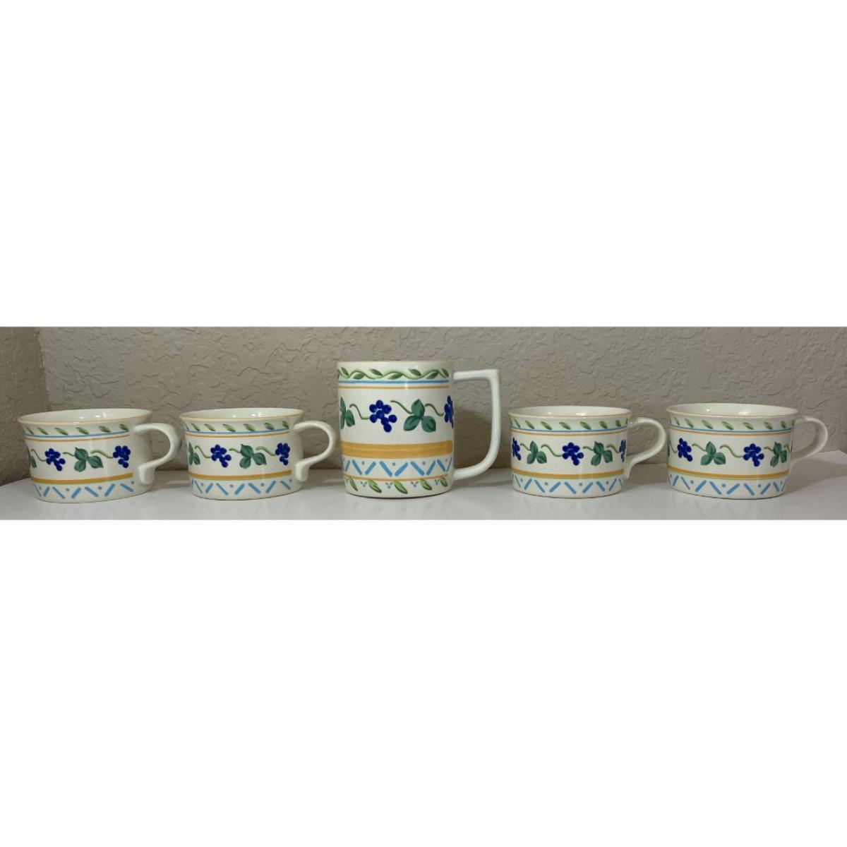 You get four coffee cups / mugs that stand approximately 2.25" tall and have a 3.5" diameter at the rim. The mug stands approximately 4" tall with a 3.25" diameter. All pieces are in good condition with minor surface wear. Please see all pictures. Thank you for looking. As a reminder, if this is a lot, we do not break up lots. Also, all items are prepacked, so each item is sent individually. Any item that qualifies for media mail and weighs over one pound will be shipped via media mail. Otherwise, the item will be shipped USPS ground advantage, or UPS ground. Shipping for this item is $13.00. Items ship within two days after payment is received. Item SKU is OTH3109.