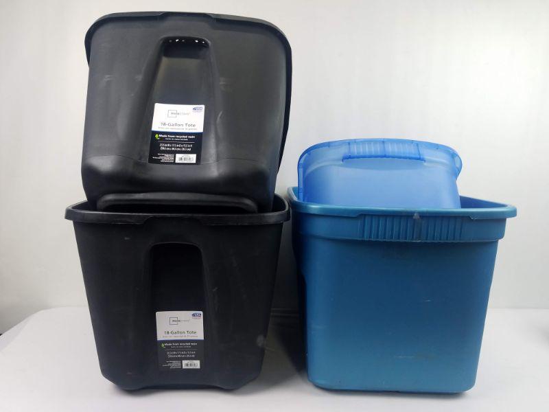 4 Misc. Bins without lids: 2 Black, 2 Blue