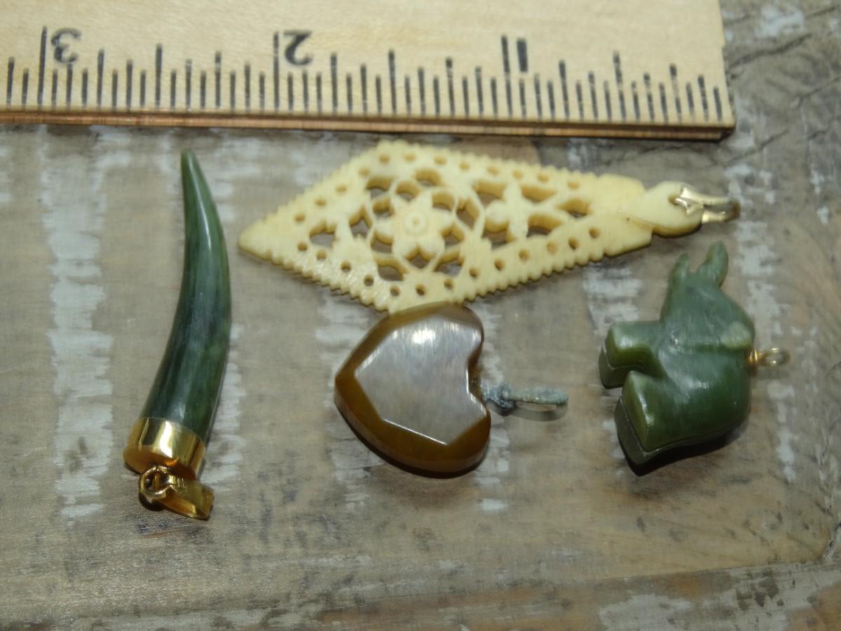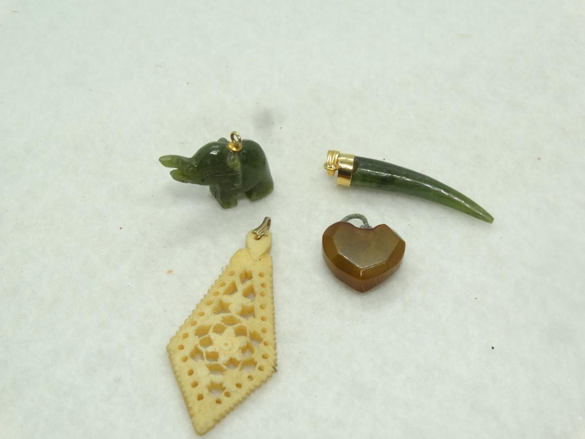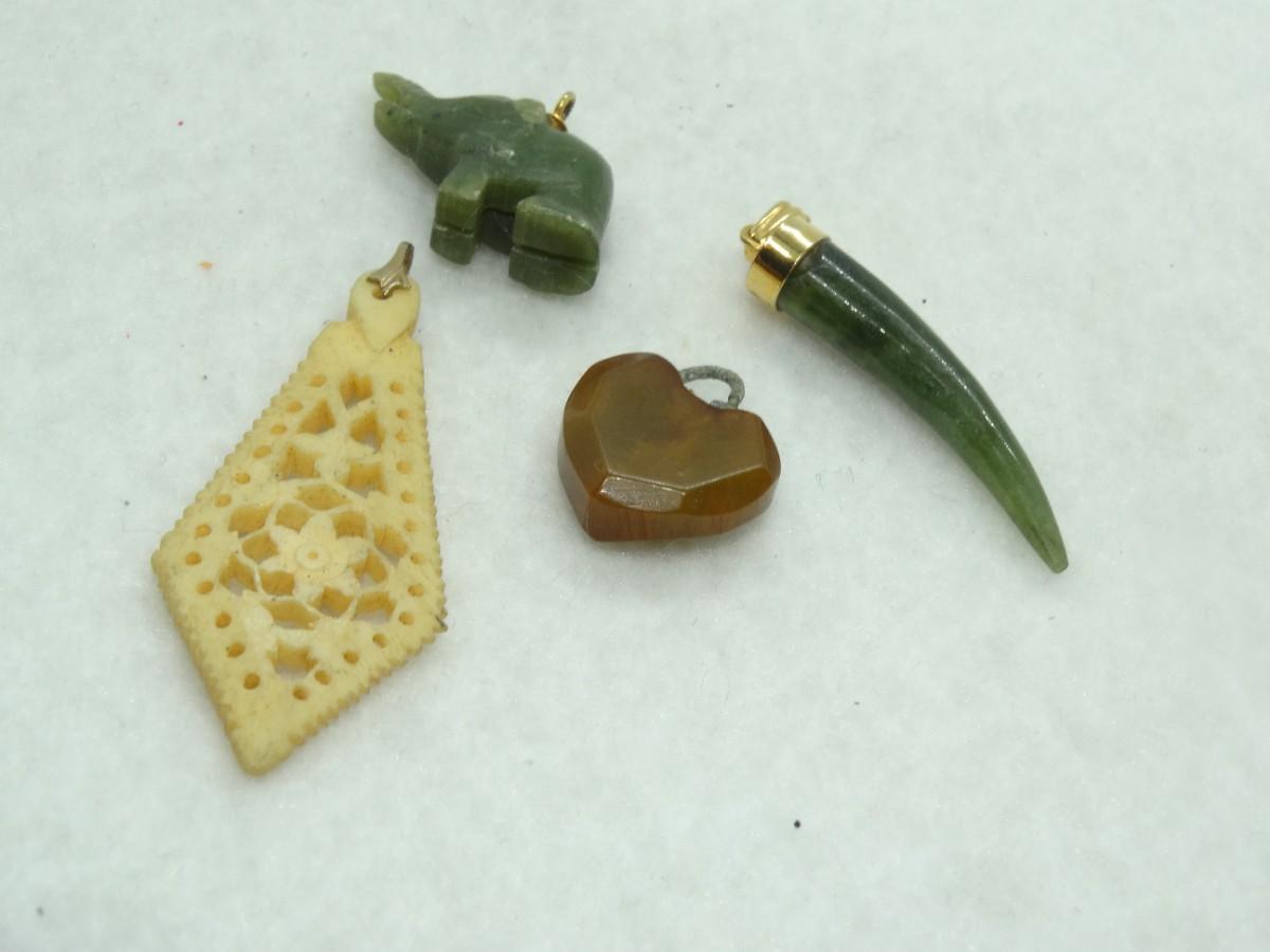 4 Misc. Carved Pieces, Horn, Heart, Elephant & Pendant