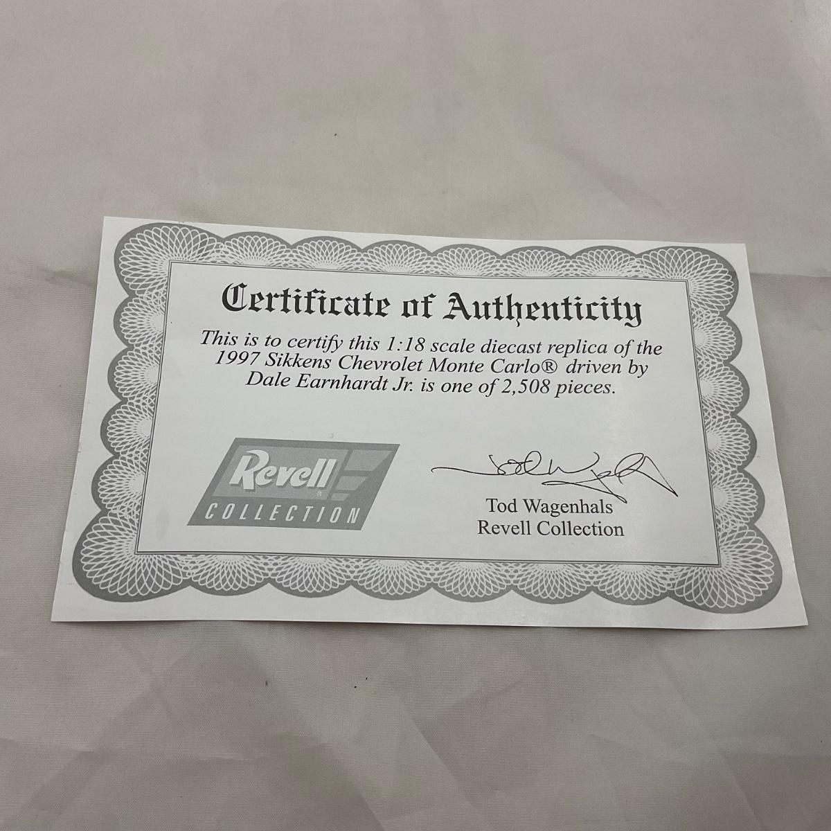 One NASCAR die cast 1:18 scale 1997 Sikkens Chevrolet Monte Carlo figure. Dale Earnhardt Jr. Comes with a Certificate of Authenticity. Please see photos for details and condition. ::: Shipping is available on this lot. If you require shipping you must let us know at the close of the auction. We will coordinate with you after the item has been won. Shipping fees will include insurance up to or exceeding the value of all items being mailed. If you have any questions regarding this lot please contact the auctioneer either via this website, by direct email or by phone. PICK UP TIMES and other important information can be found in the TERMS and DESCRIPTION of the auction. Please take a look for pertinent information. Thanks!