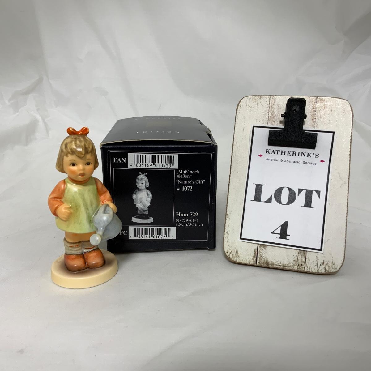She’ll water your garden for you! Nature’s Gift, Hum 729, 3 3/4 inches tall, TMK-7. Comes with original box and shipping box. Please see photos for details and condition. - No Cracks, Chips or Crazing Noted. ::: Shipping is available on this lot. If you require shipping you must let us know at the close of the auction. We will coordinate with you after the item has been won. Shipping fees will include insurance up to or exceeding the value of all items being mailed. If you have any questions regarding this lot please contact the auctioneer either via this website, by direct email or by phone. PICK UP TIMES and other important information can be found in the TERMS and DESCRIPTION of the auction. Please take a look for pertinent information. Thanks!