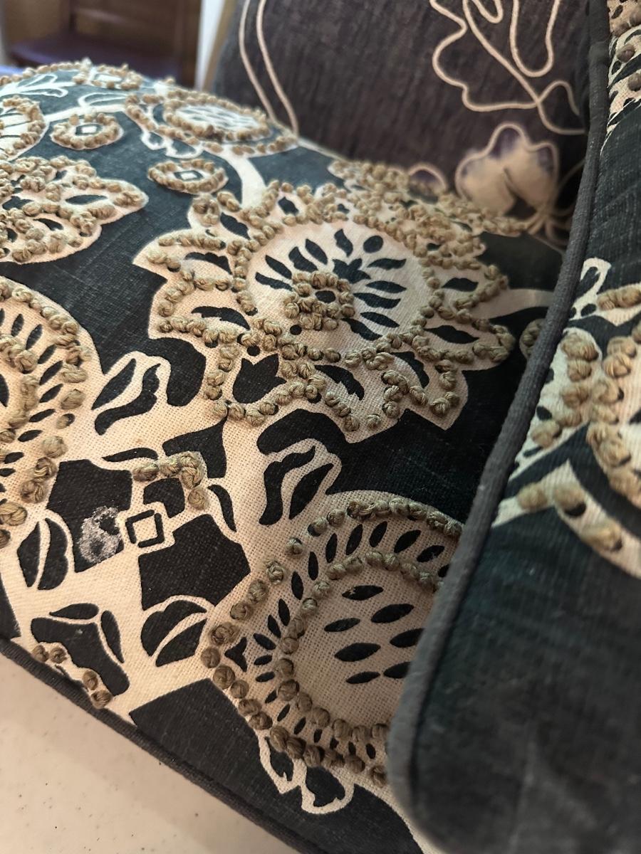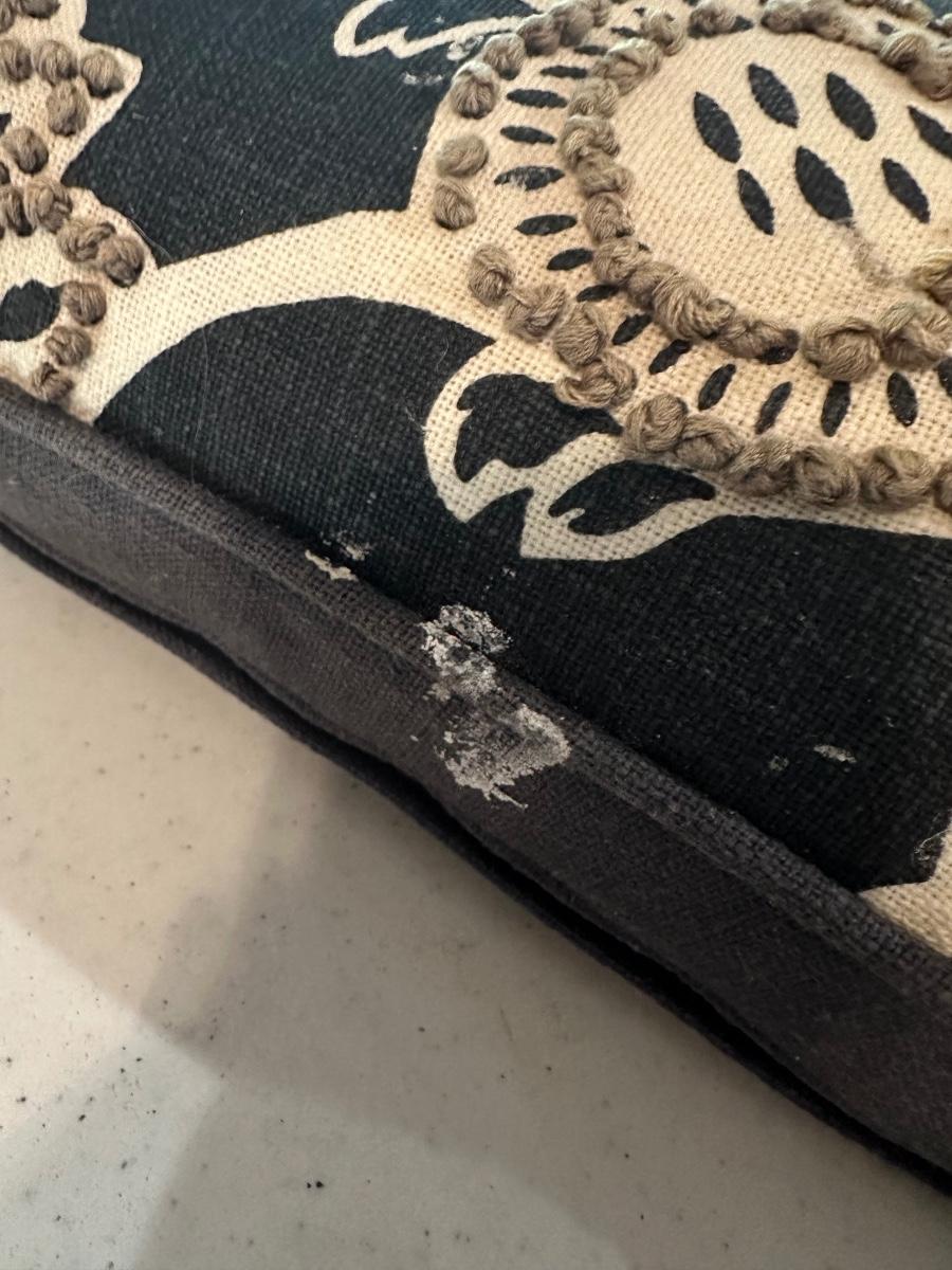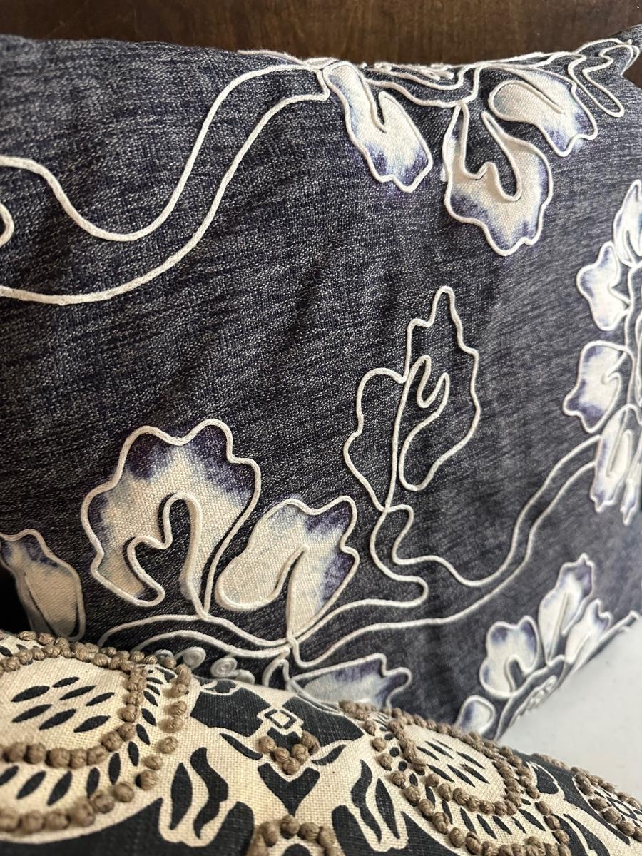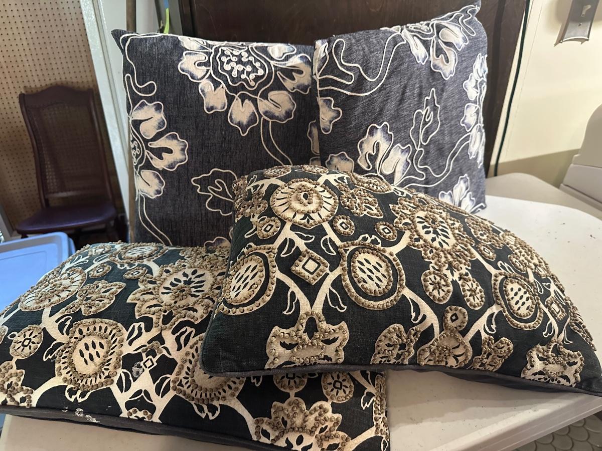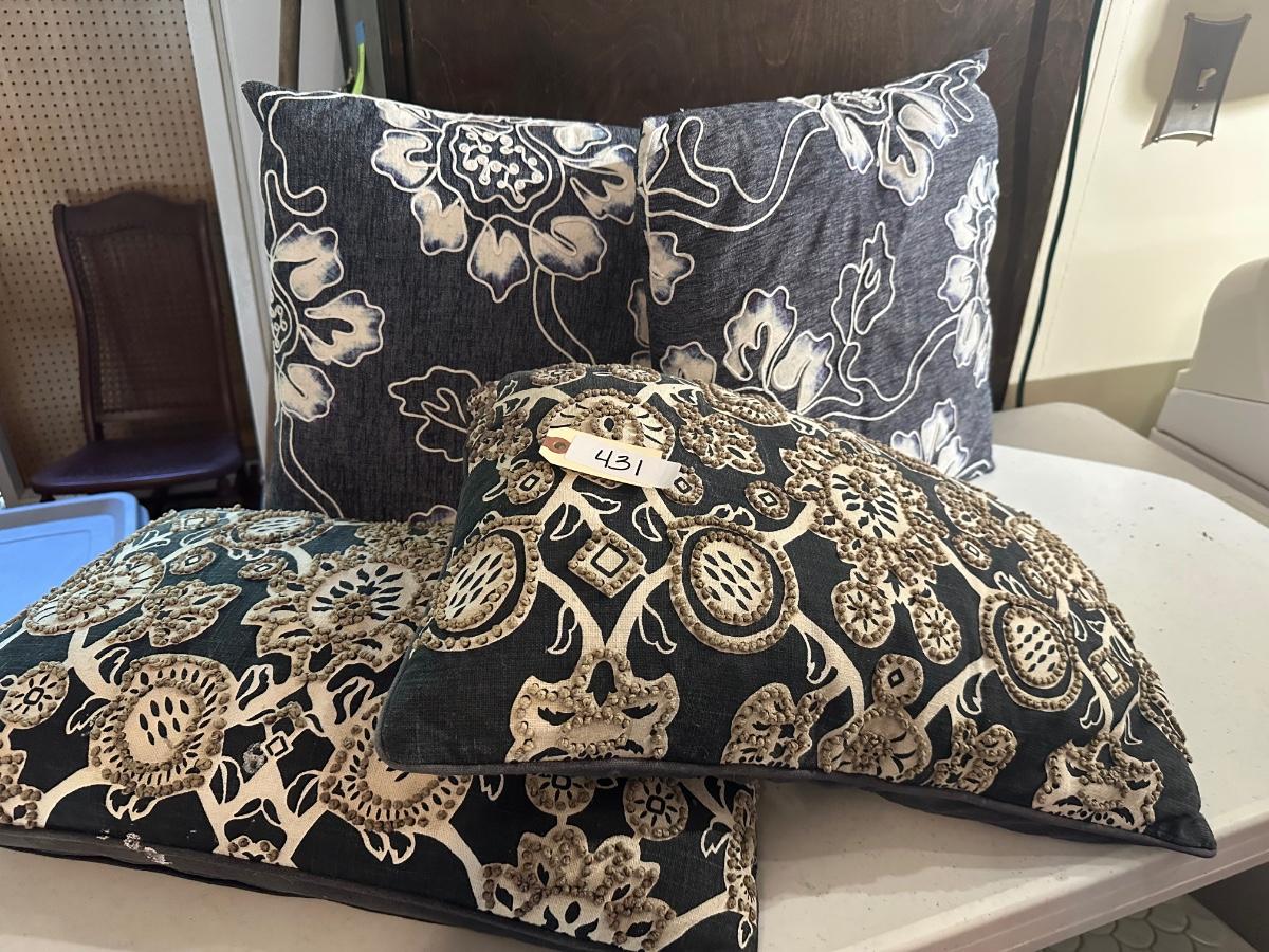 4 NAVY PILLOWS, ONE HAS STAINS ON BOTTOM