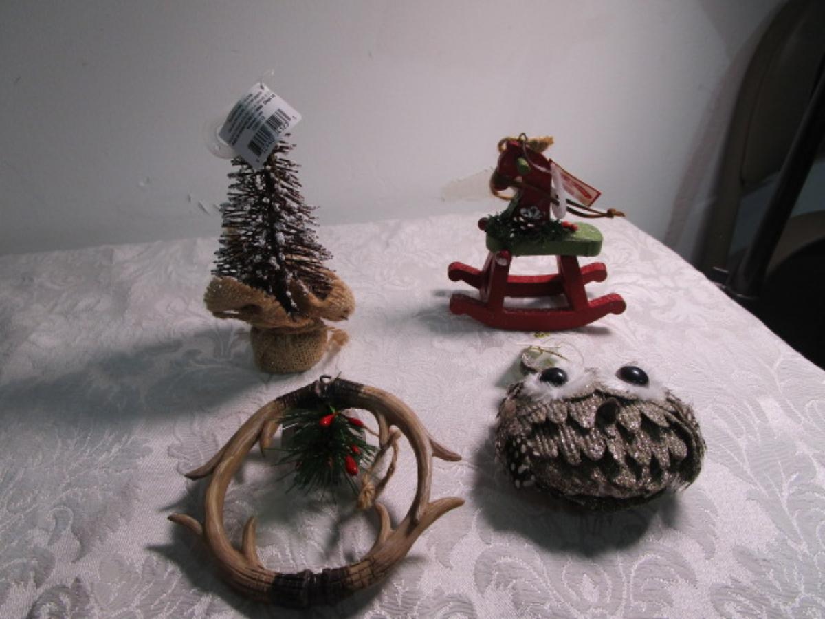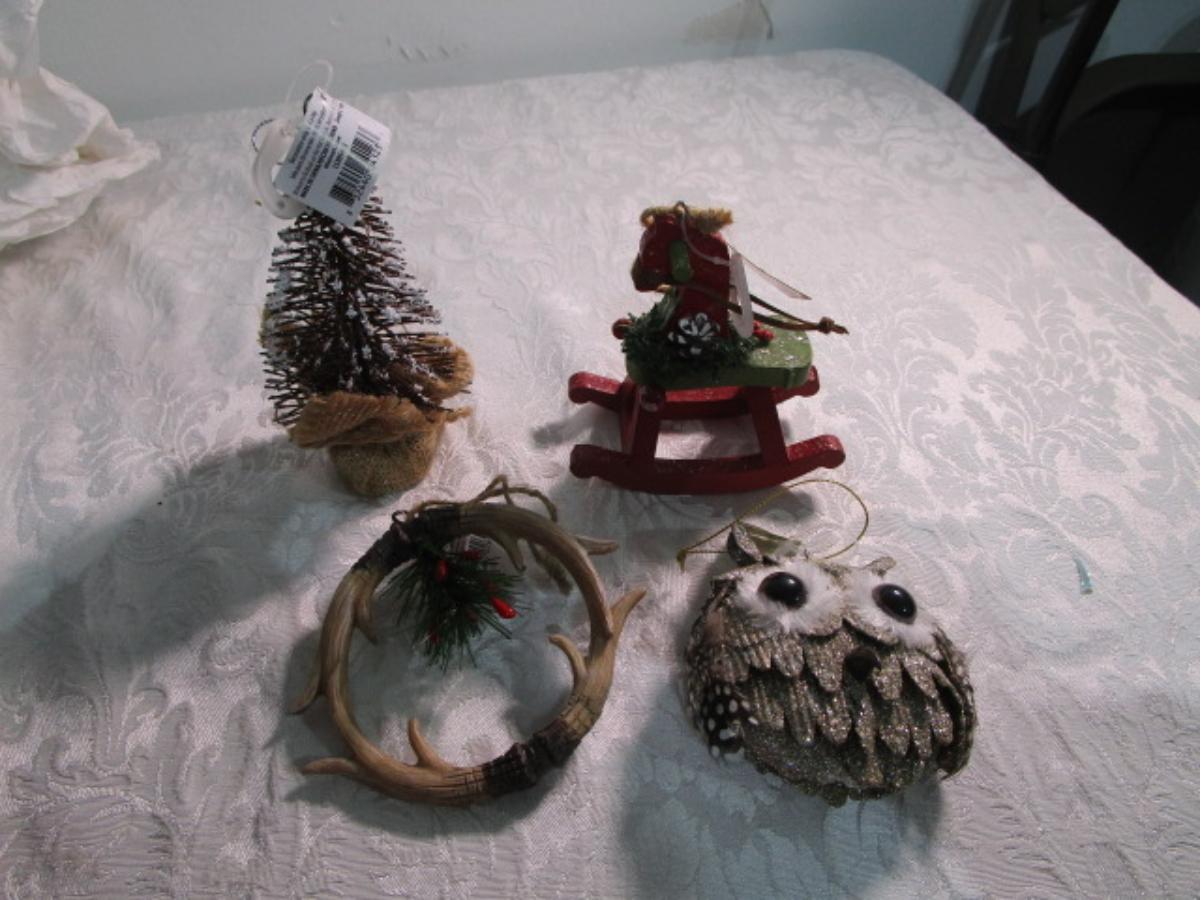 1 tree, 1 antler wreath, 1 rocking horse, 1 owl, see pictures