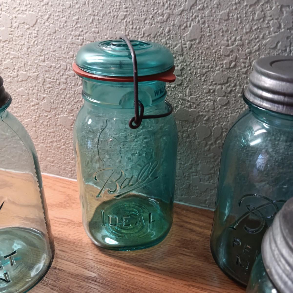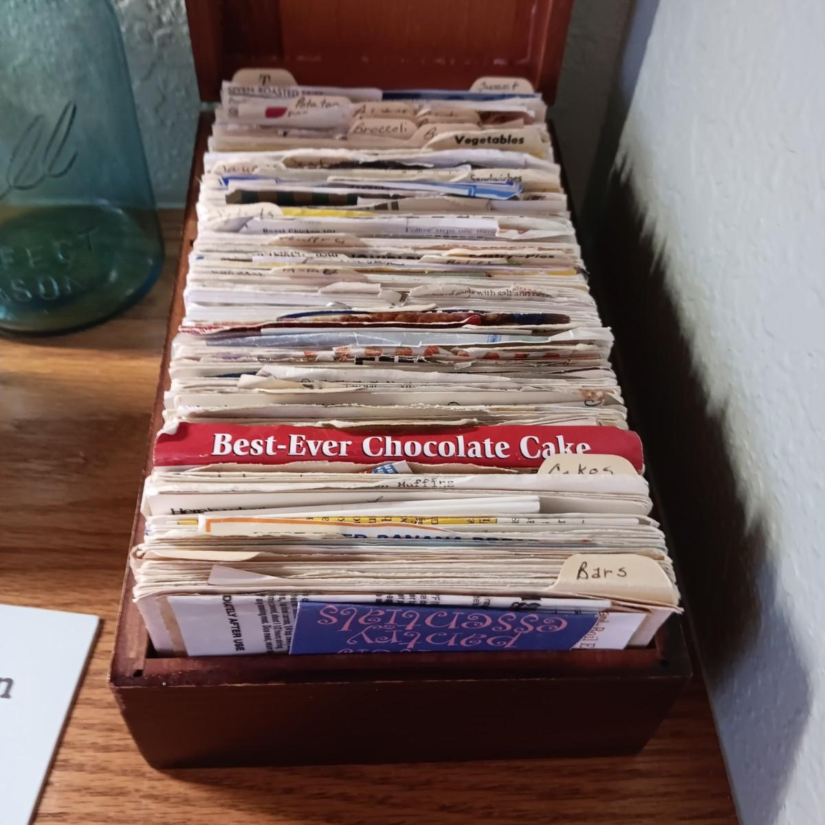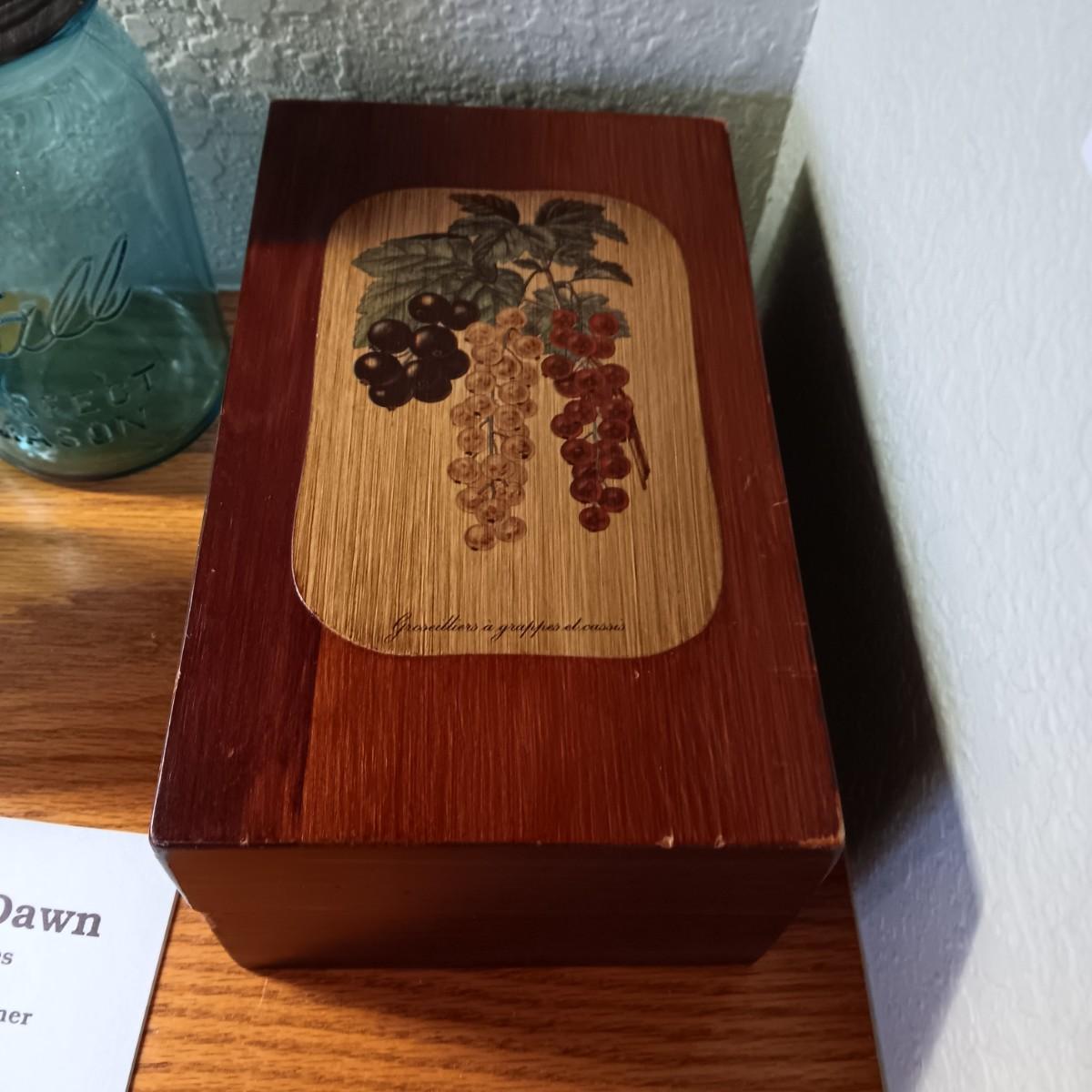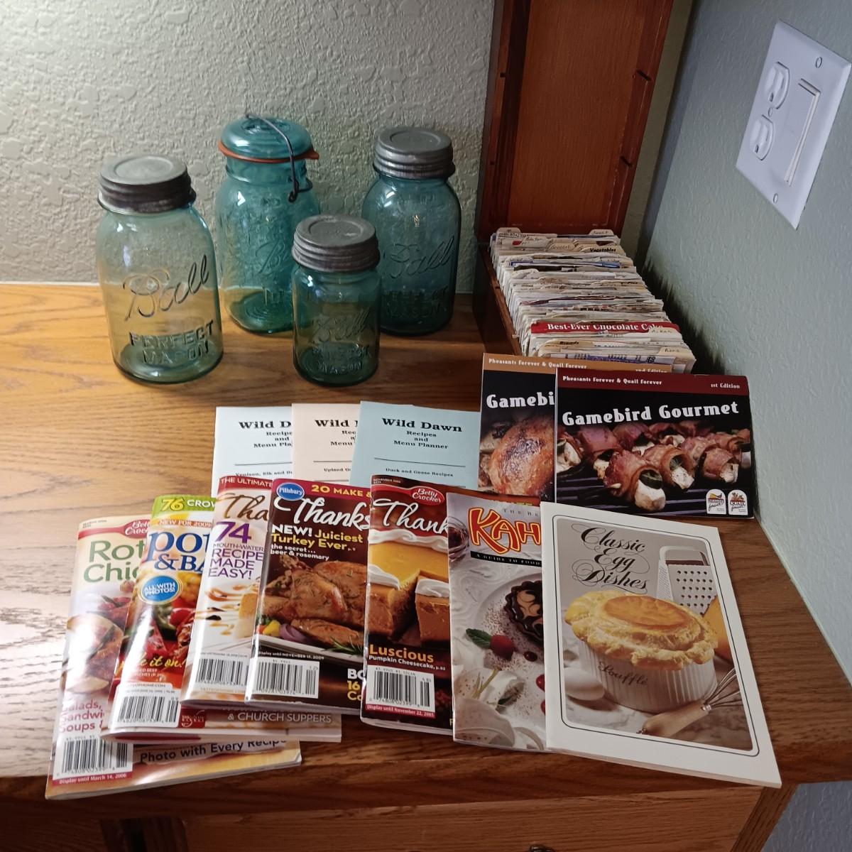4 OLD CANNING JARS, A LARGE WOODEN BOX OF RECIPES AND RECIPE PAMPHLETS