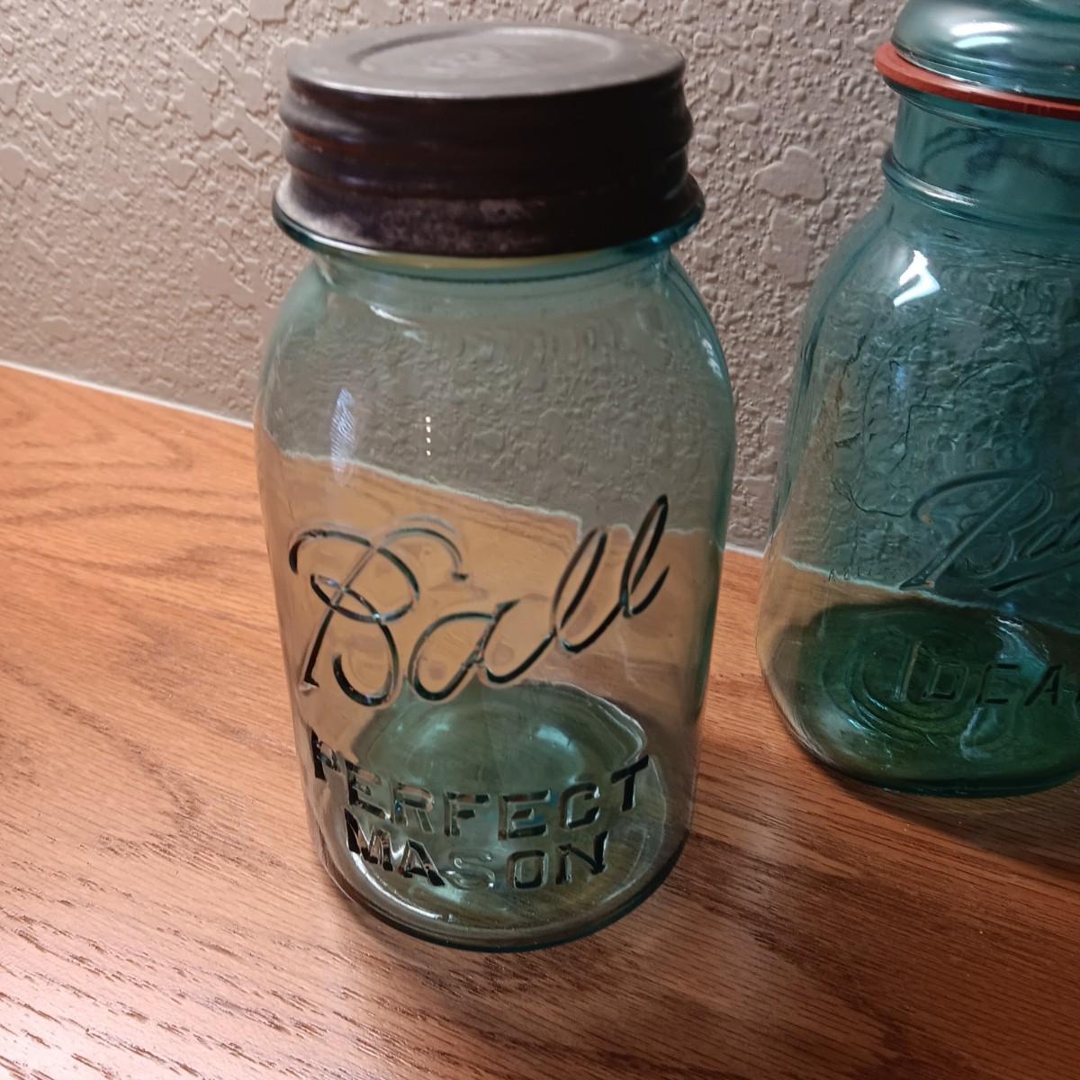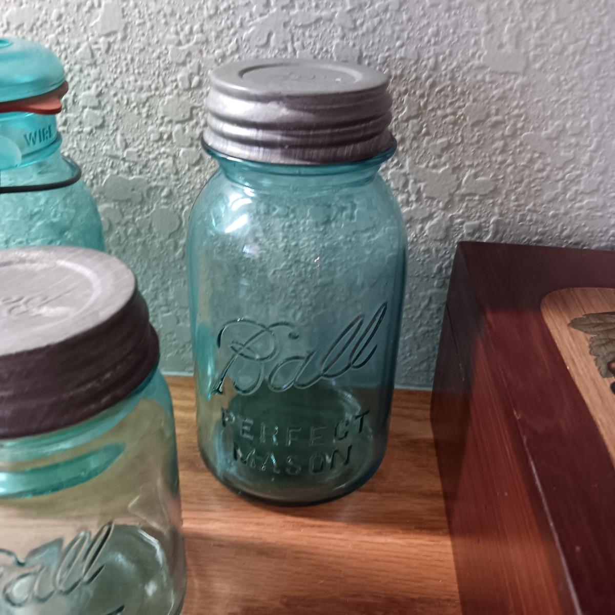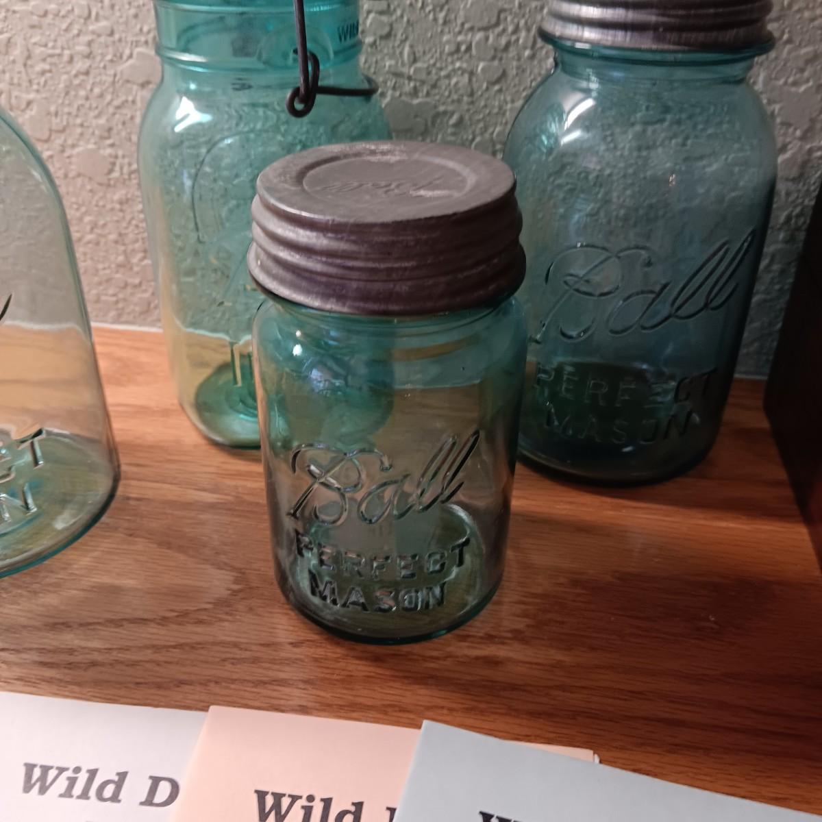 4 OLD CANNING JARS, A LARGE WOODEN BOX OF RECIPES AND RECIPE PAMPHLETS