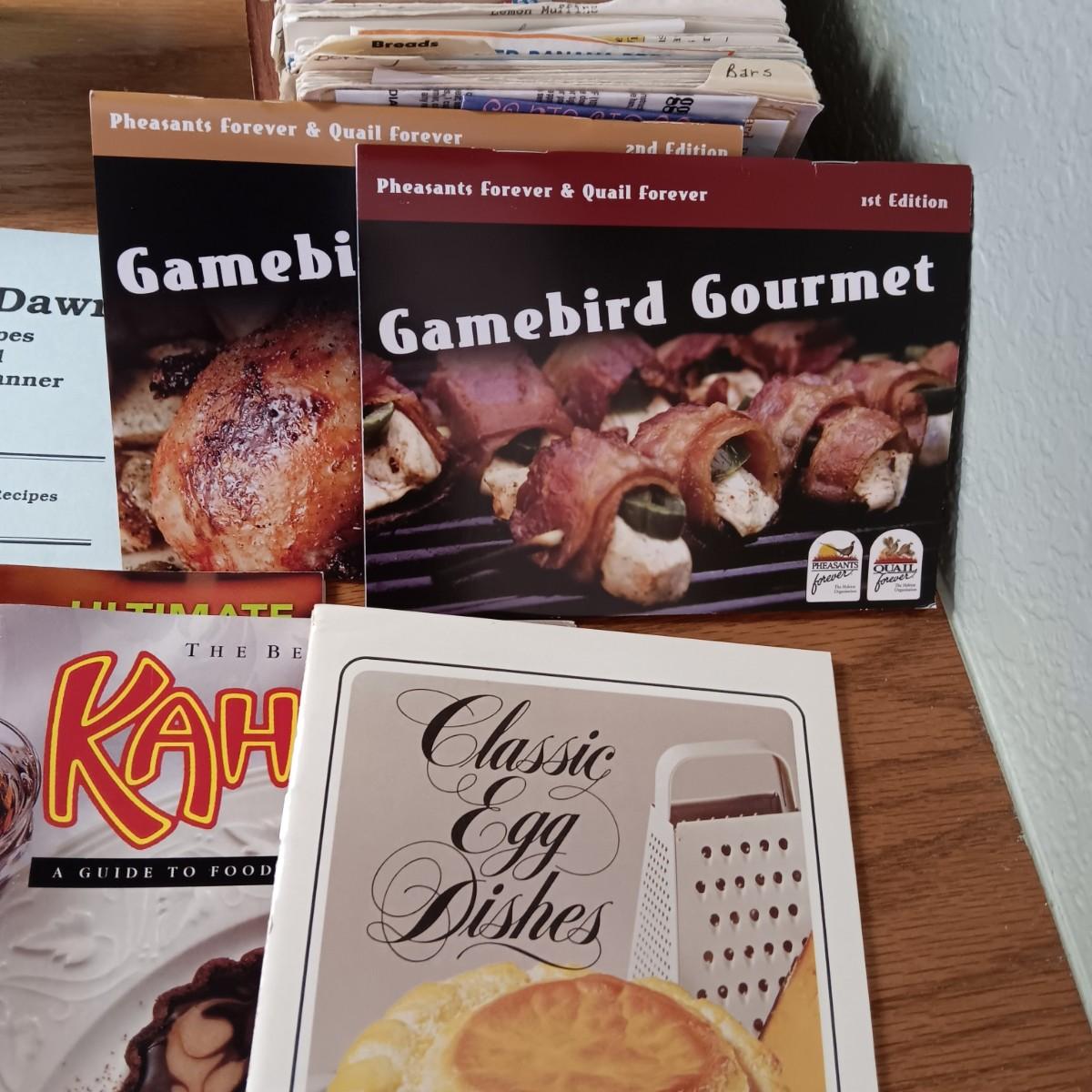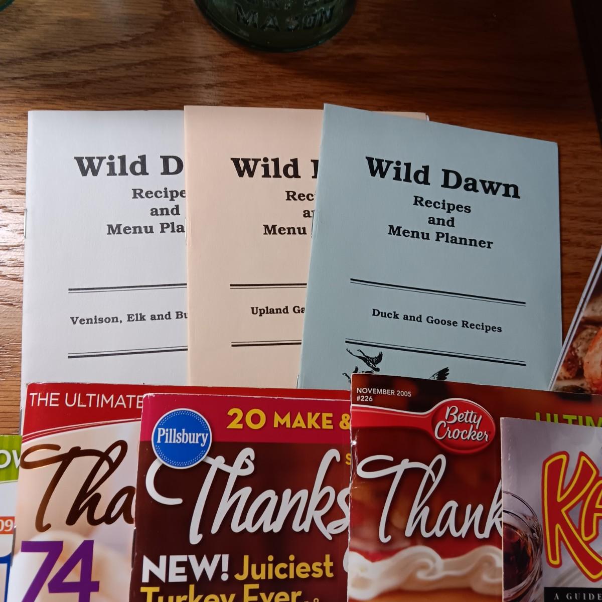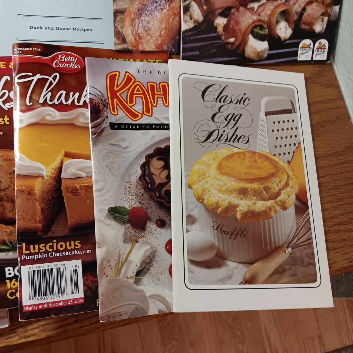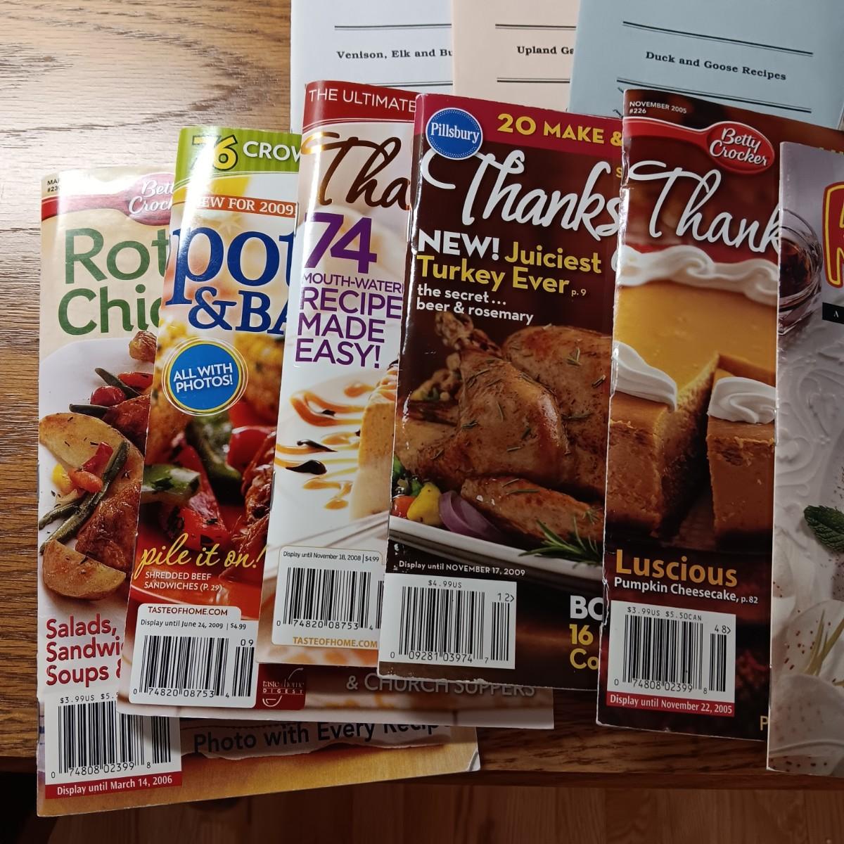 4 OLD CANNING JARS, A LARGE WOODEN BOX OF RECIPES AND RECIPE PAMPHLETS