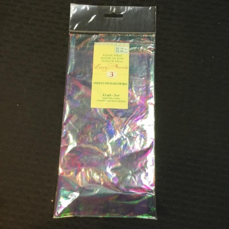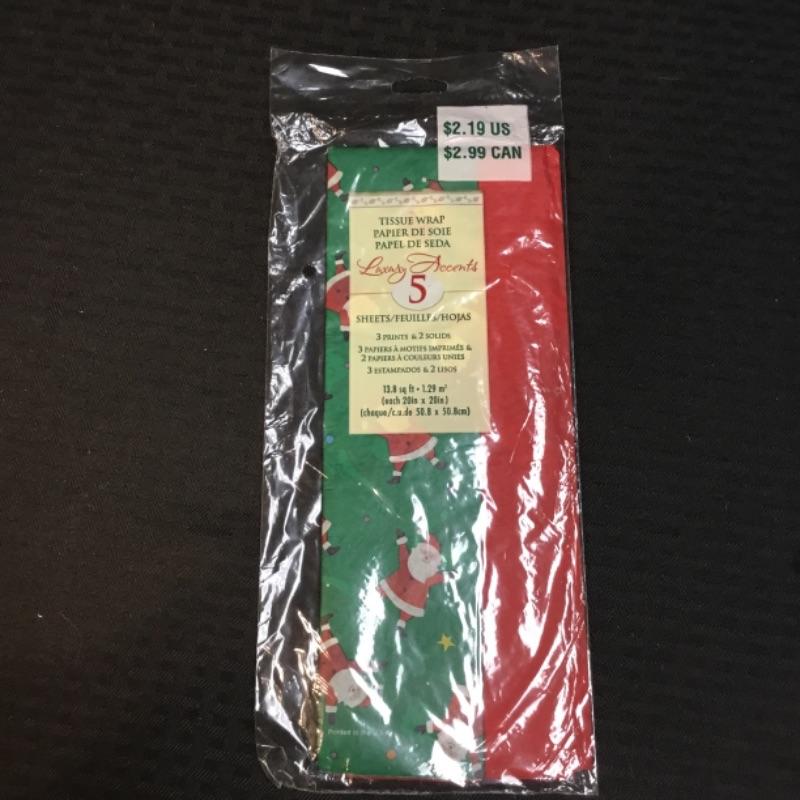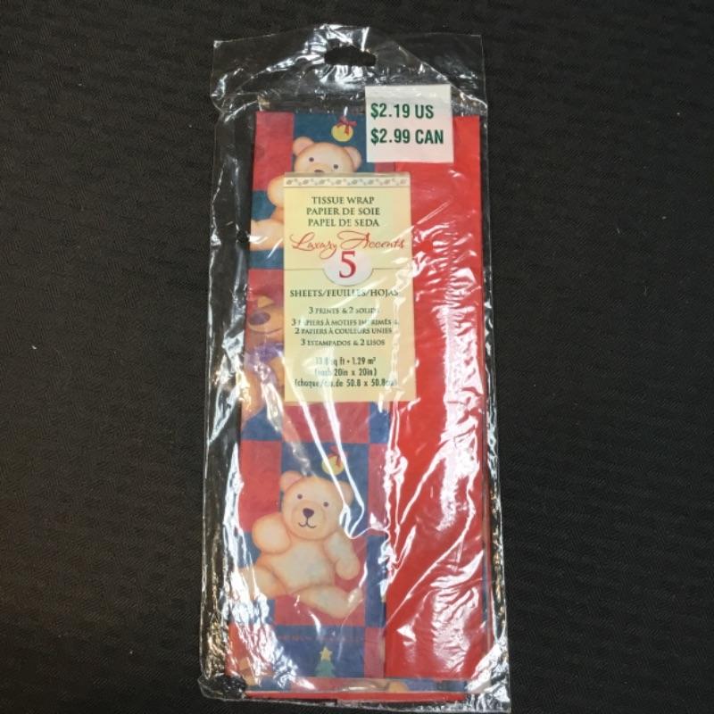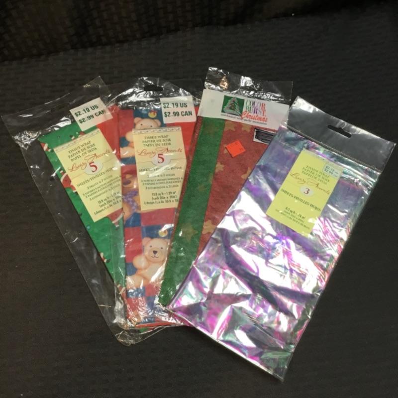 Up for auction or four packages of gift wrap tissue. All are sealed in the original packaging. The Santa Claus themed one is 13.8 ft.², the teddy bear one is 13.8 ft.², The shiny iridescent one is 8.3 ft.², the one with stars is 14 ft.². See pictures.