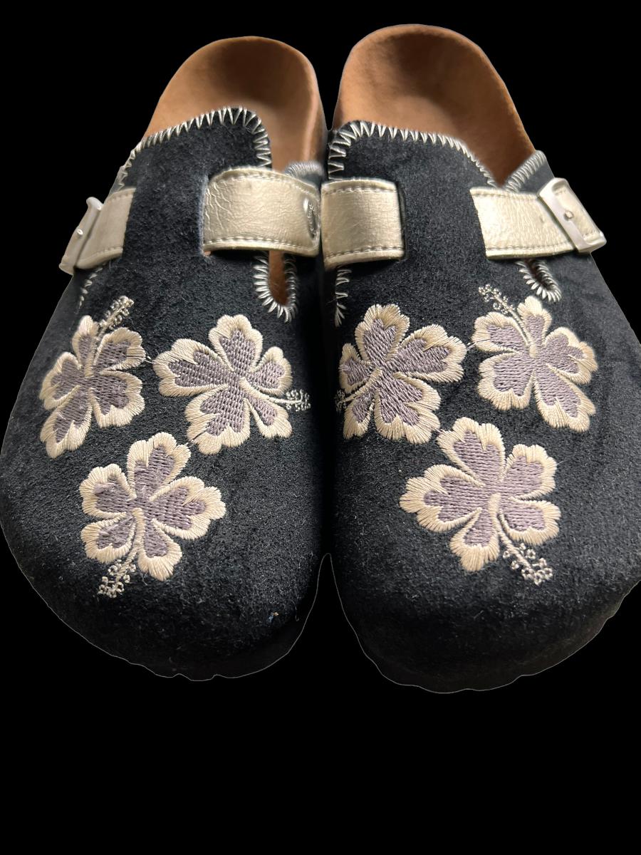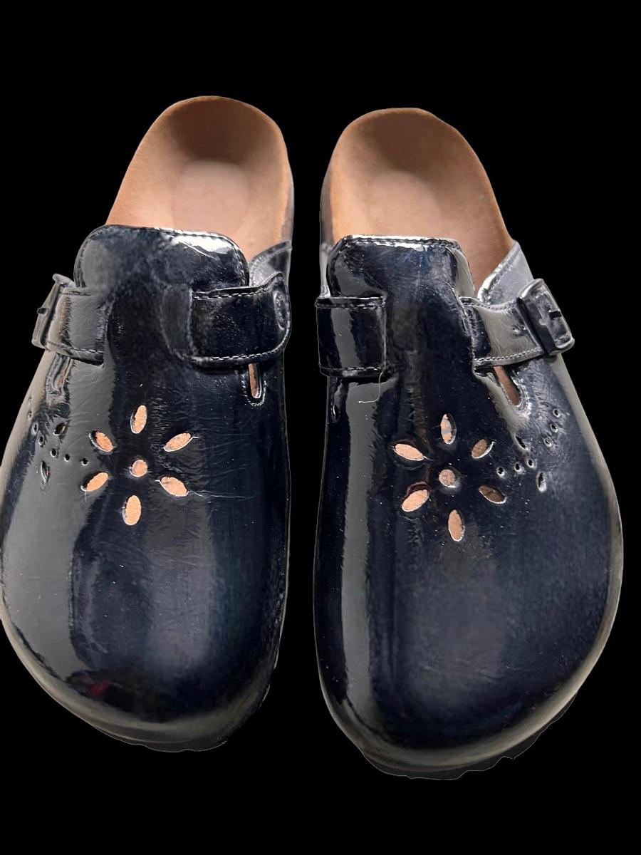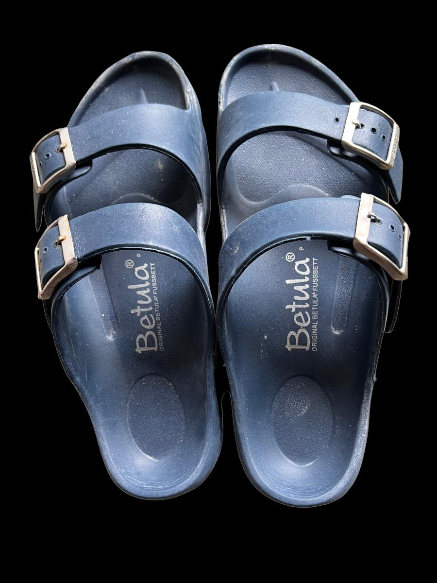 3 pairs of Betula Clogs one pair of Betula sandals by Birkenstock. Floral and black patent leather look to be new without tags. The other two are in worn condition. Blue are Betula by Birkenstock neoprene sporty sandals.