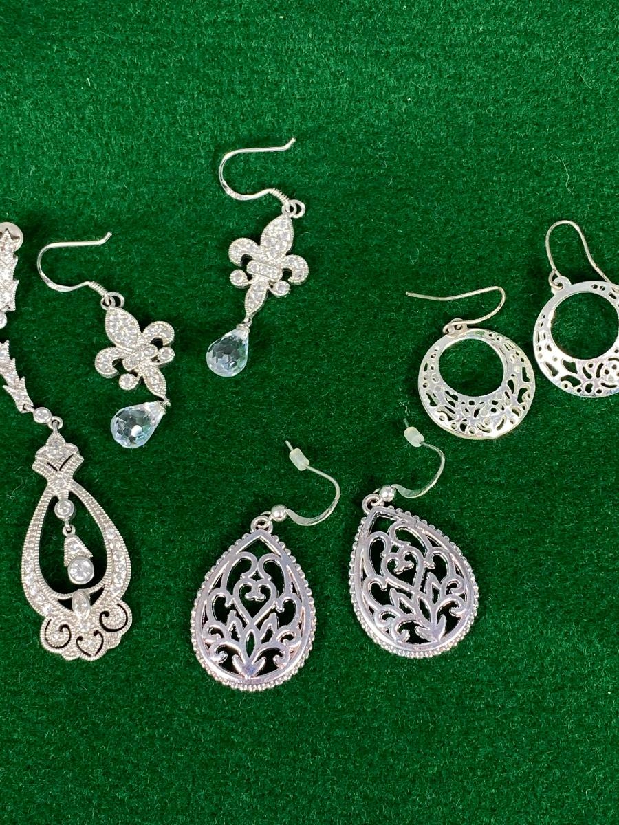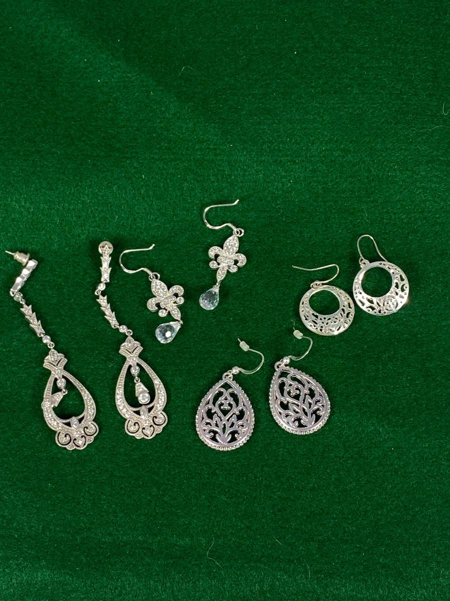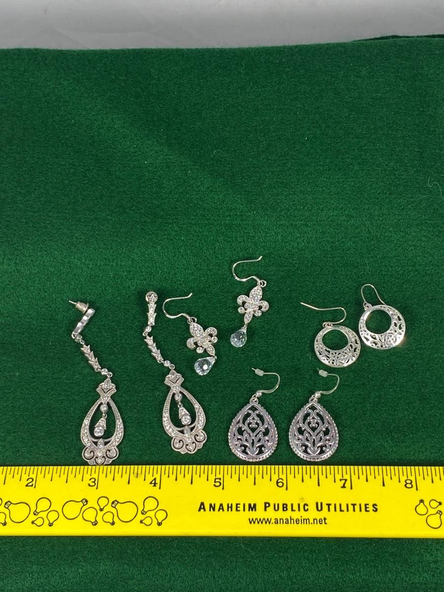 4 pairs of dangling siler tone earrings. No sterling marks noticed. Some with rhinestone accents. All in good condition.