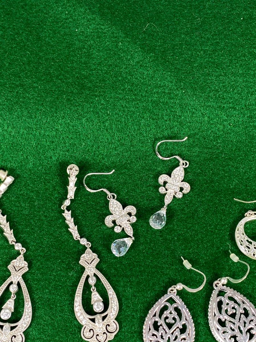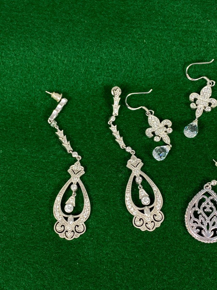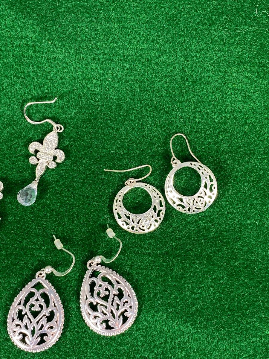 4 pairs of dangling siler tone earrings. No sterling marks noticed. Some with rhinestone accents. All in good condition.