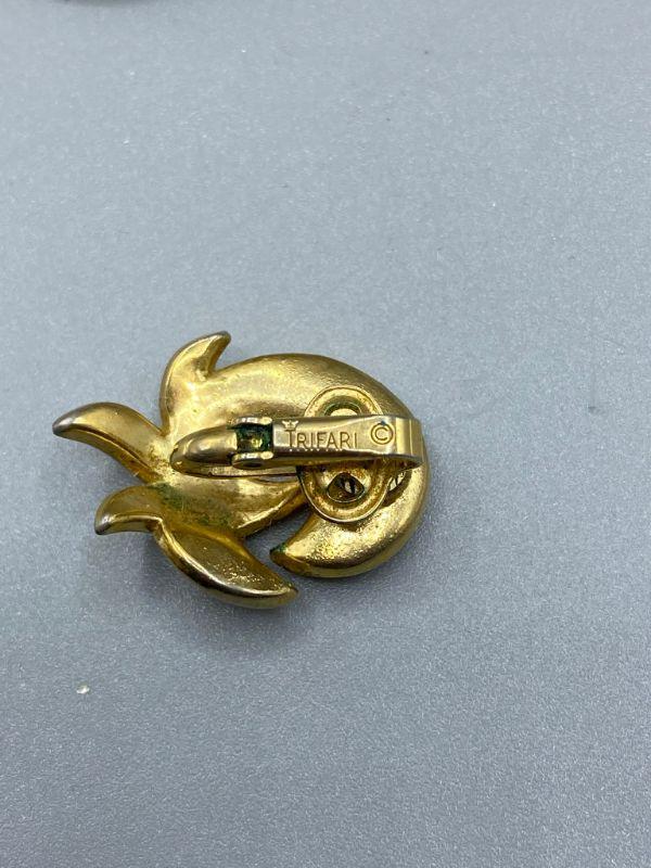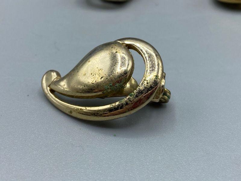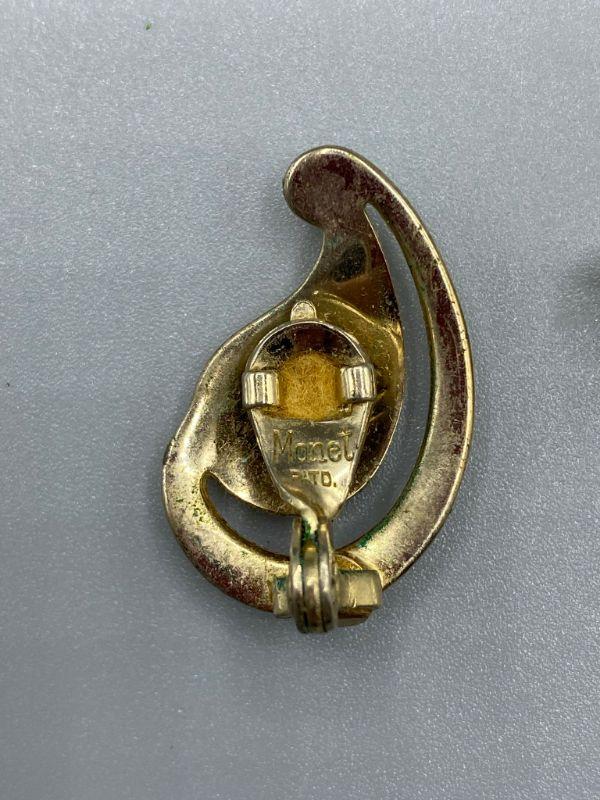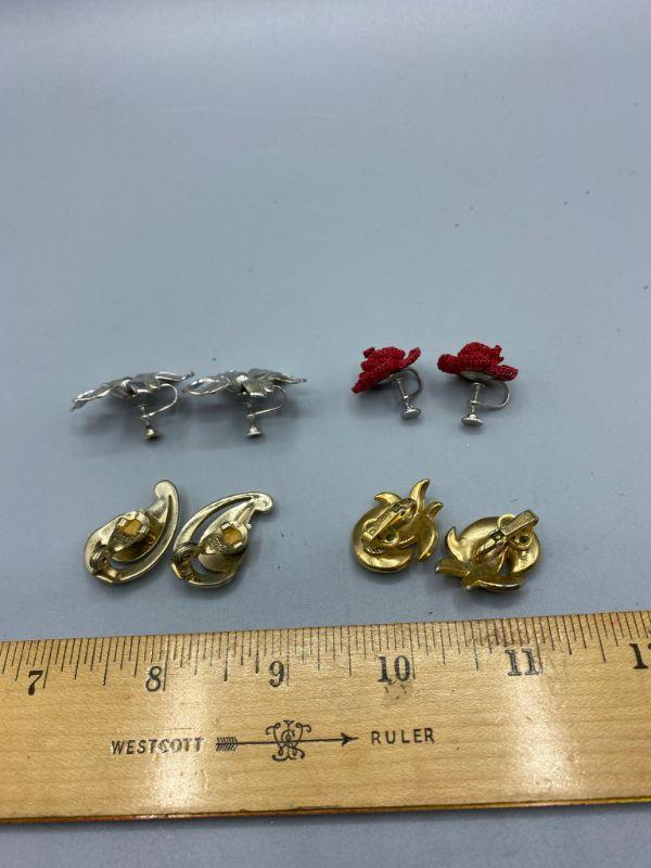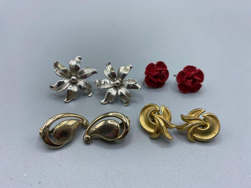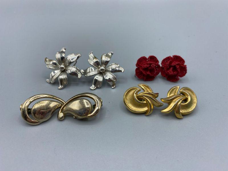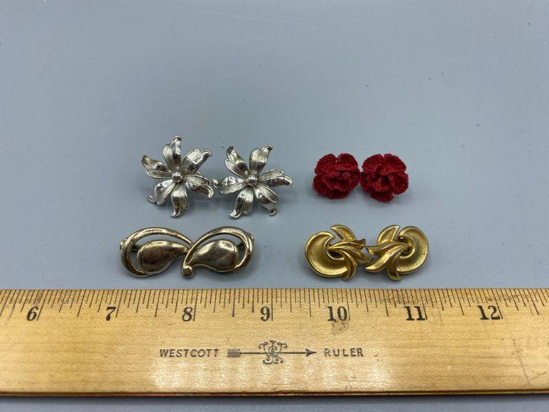 4 pairs of vintage earrings. Two are clip and two are screwback. The flowers are knitted, like a doily. The paisley shape are Monet, they have some corrosion, need to be cleaned. The goldtone are Trifari.