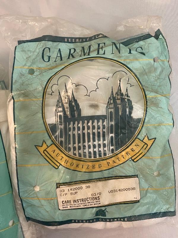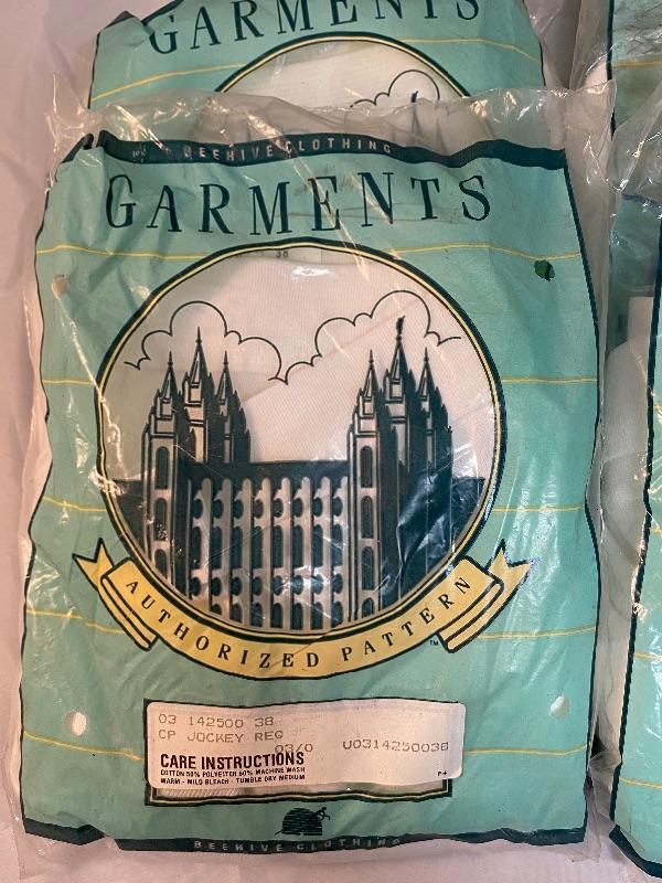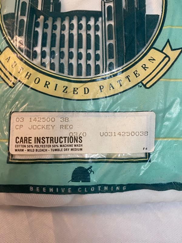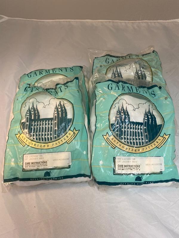 4 pairs of Men's White Jockey Shorts. Made by Beehive Clothing. Unopened package, it looks like there is one pair per package. One has discoloration spots from dirt getting in package holes.