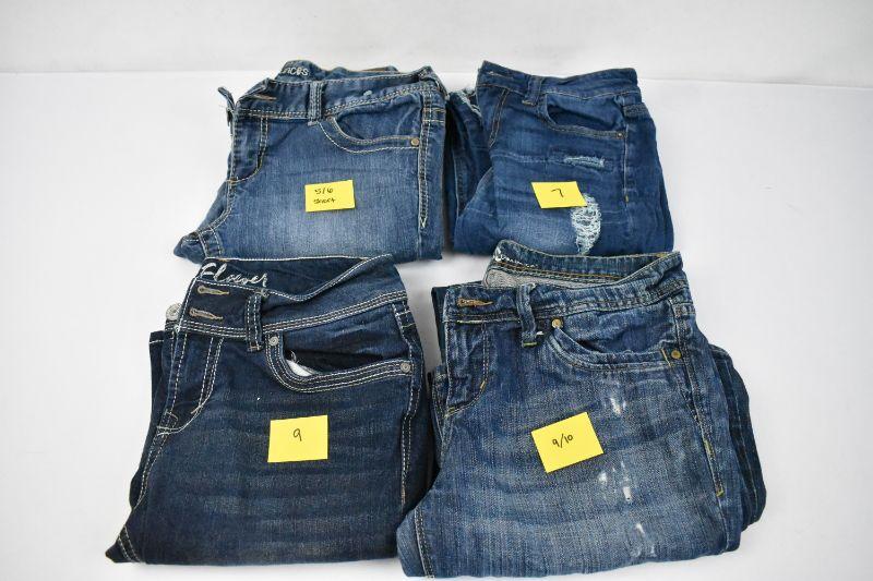 4 Pairs of Women's Jeans: Maurices Size 5/6, Vanilla Star Size 7, Wallflower Size 9, Madison 9/10
