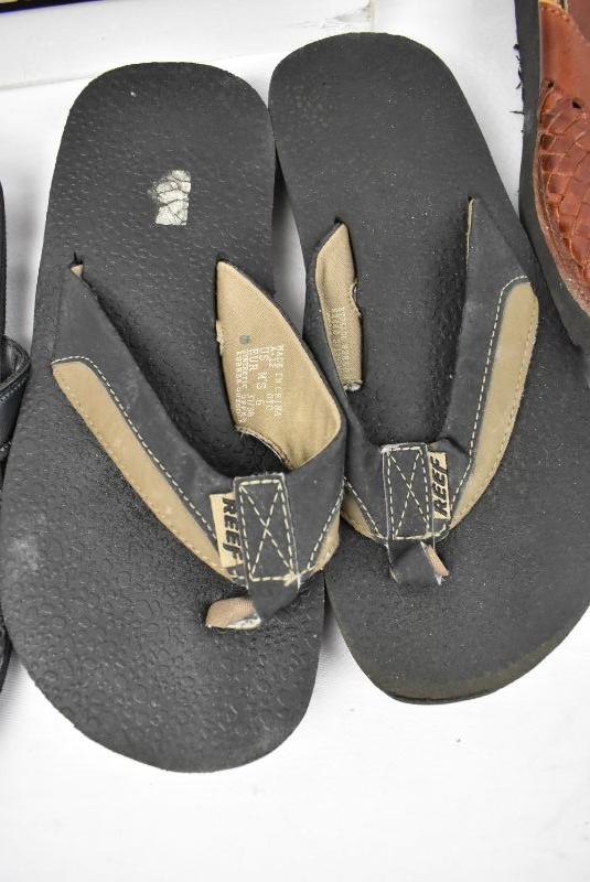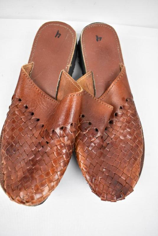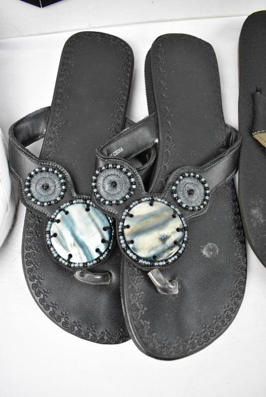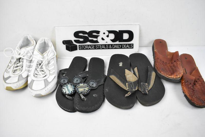4 pairs of Women's Shoes size 6: Tennis Shoes, Flip Flops, Brown Slip Ons
