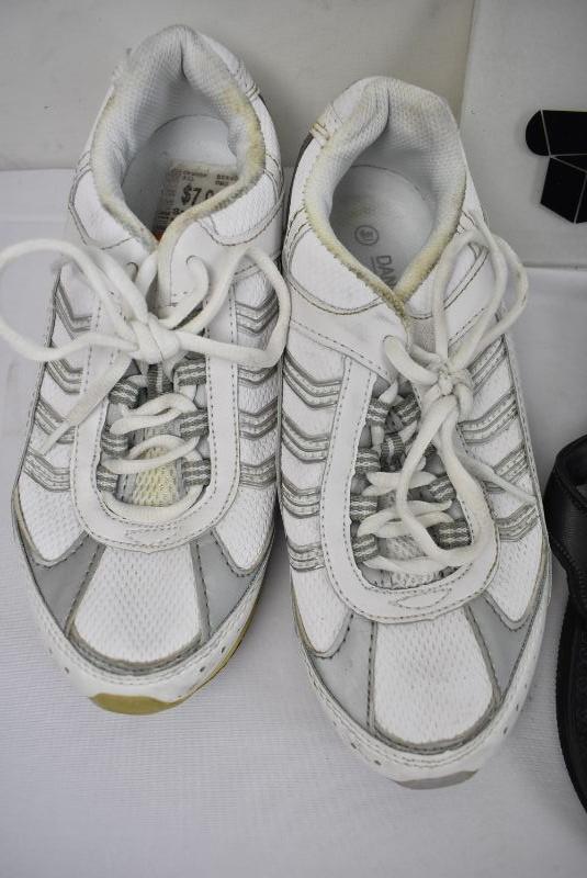 4 pairs of Women's Shoes size 6: White Tennis Shoes, 2 Black Flip Flops, Brown Slip Ons