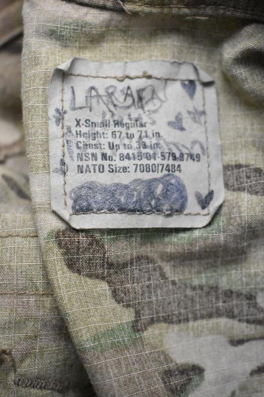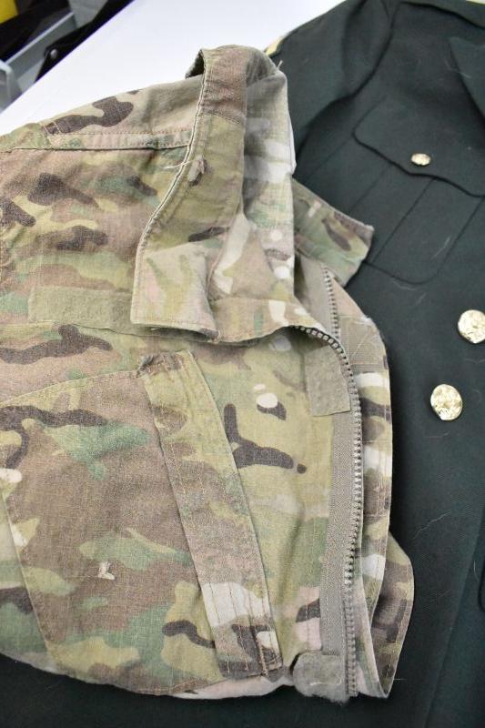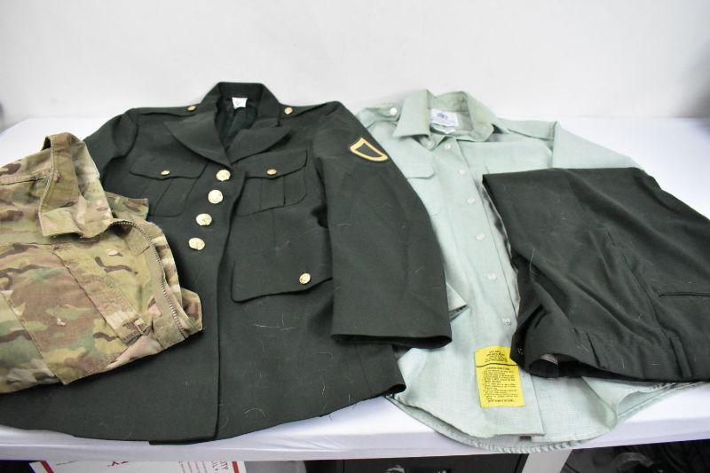 4 pc Army Clothing: Green Suit, Shirt, Camo Shirt: XS, 37S, 32S, & 15 1/2 x 30/31 Needs Cleaning