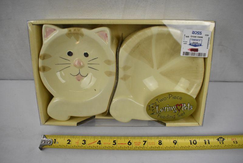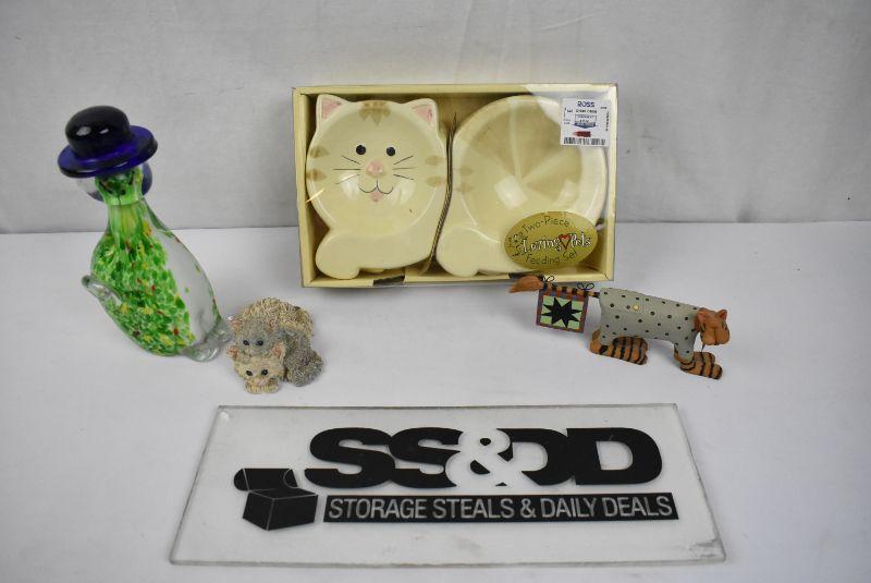 4 pc Cat Theme Decor: 3 Figurines & 2 pc Feeding Set