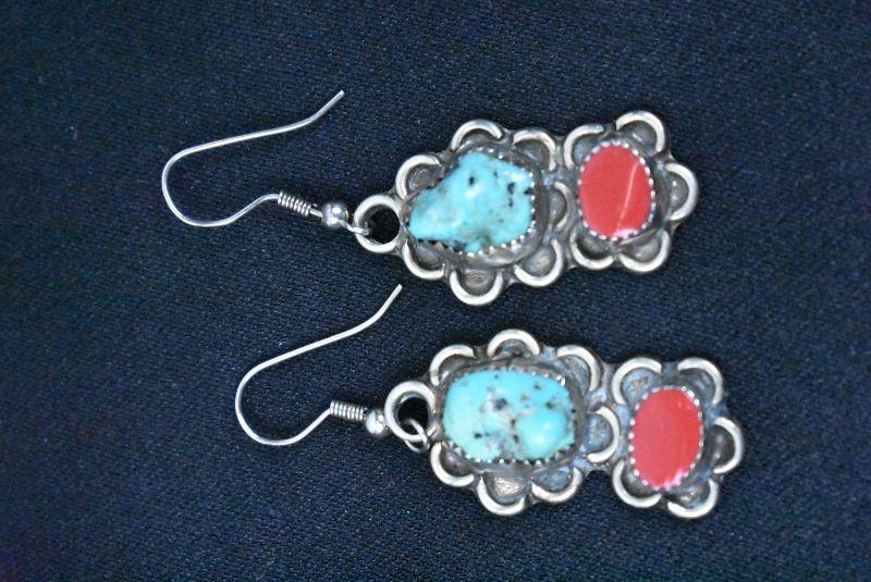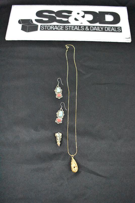 4 pc Costume Jewelry Lot: Turquoise Earrings, Gold-Toned Necklace with Pendant, Extra pendant needs cleaning