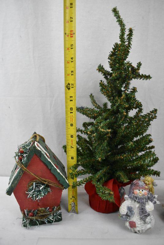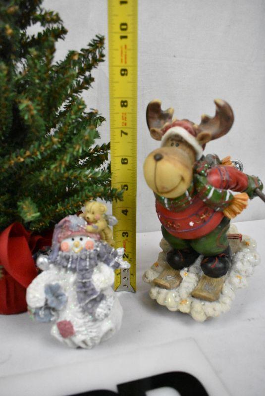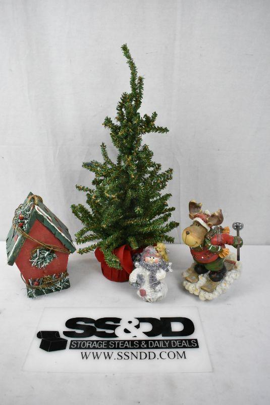 4 pc Holiday Decor: Birdhouse, Tree, Snowman, Skiing Moose