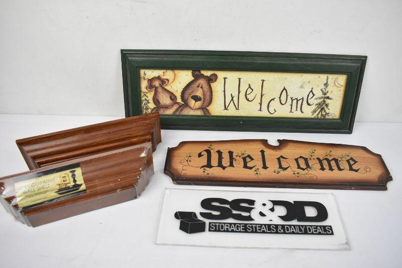 4 pc Home Decor: 2 Welcome Signs & 2 Decorative Wall Shelves