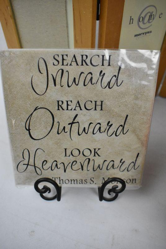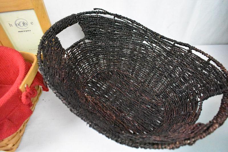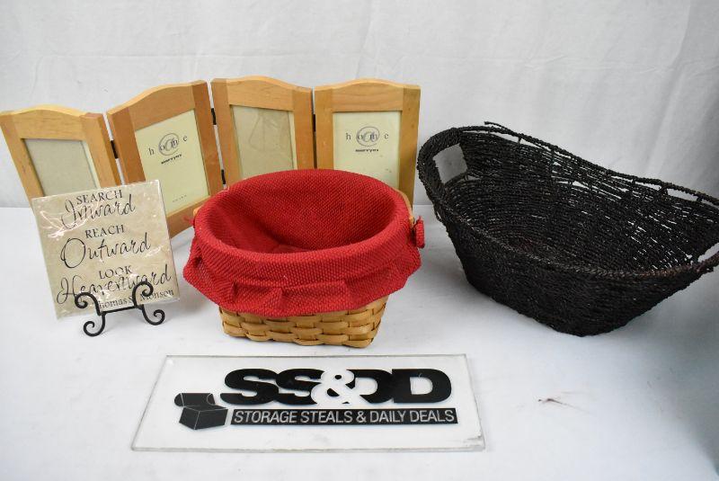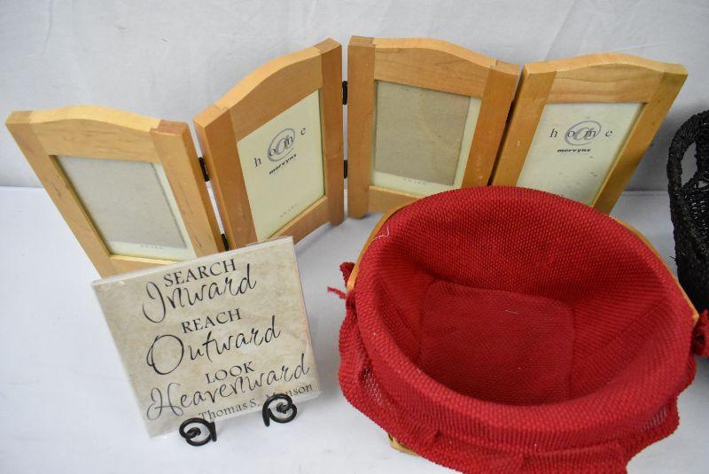 4 pc Home Decor: Accordian Frame, 2 Baskets, 1 tile with stand
