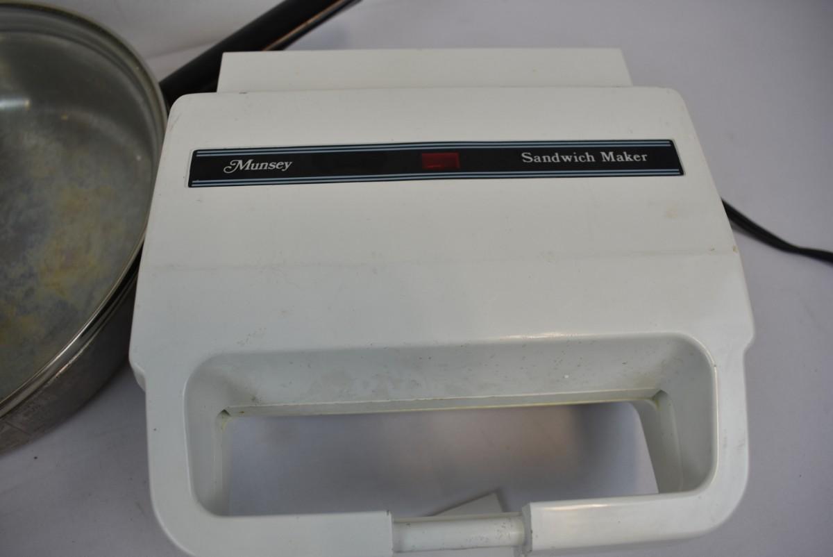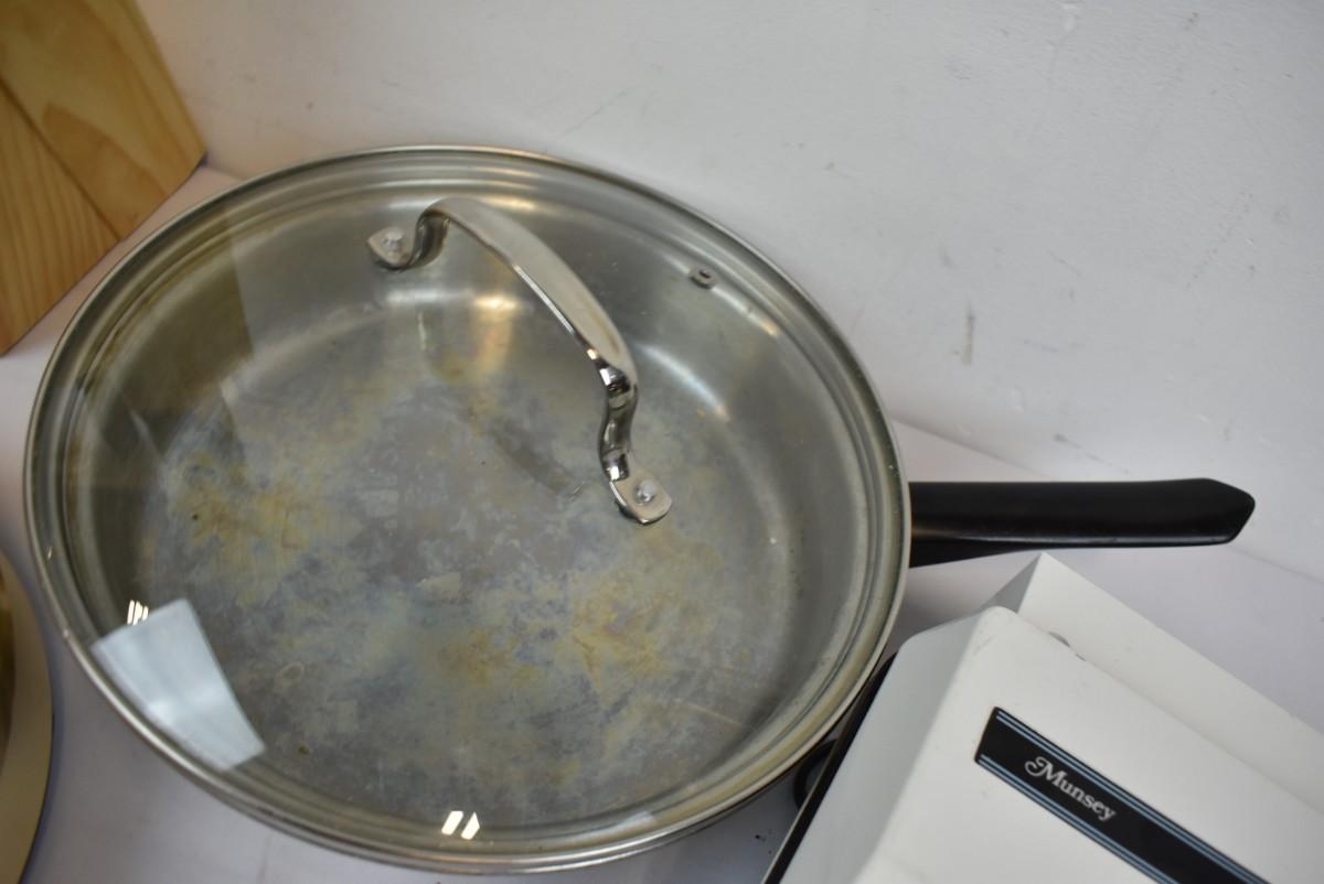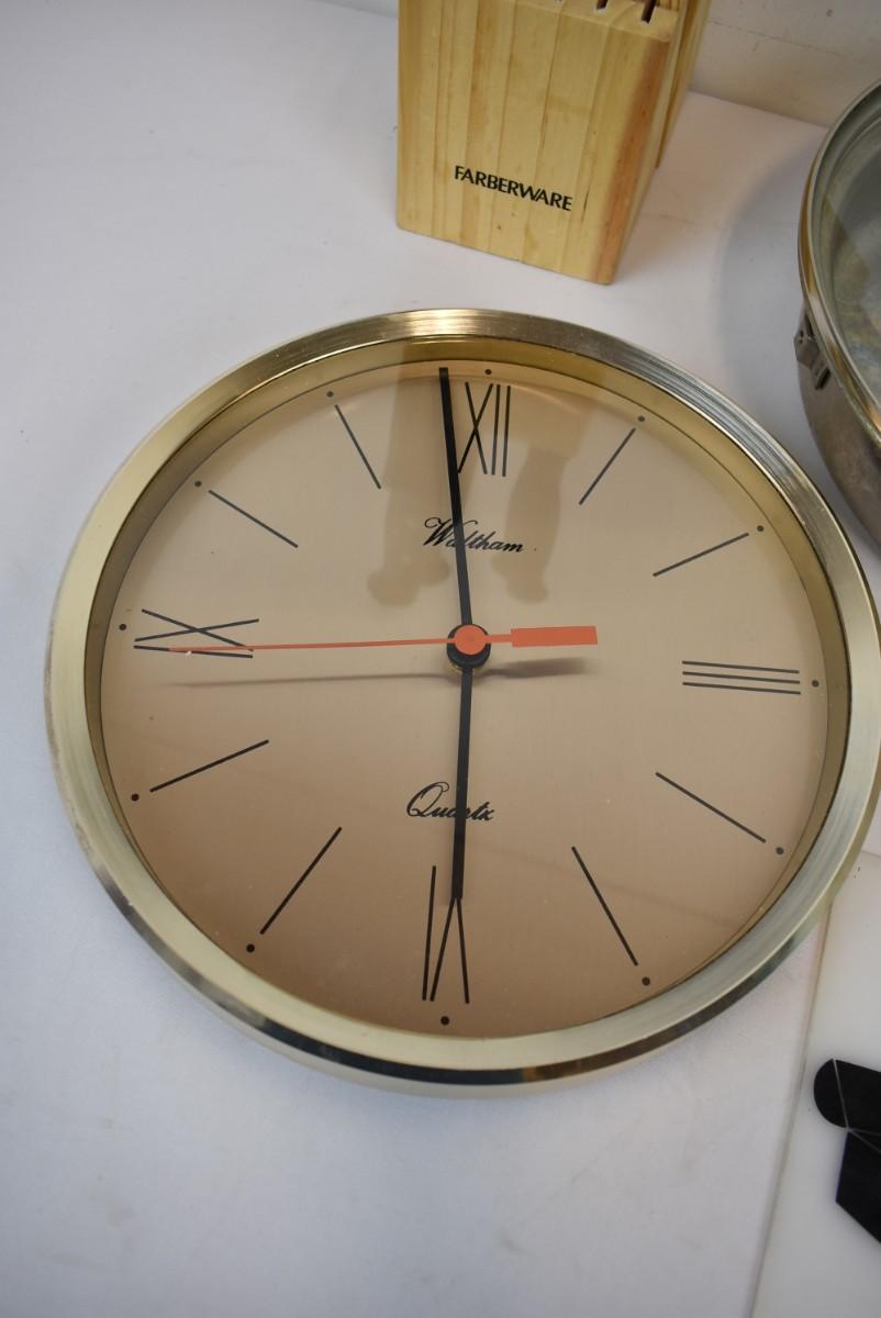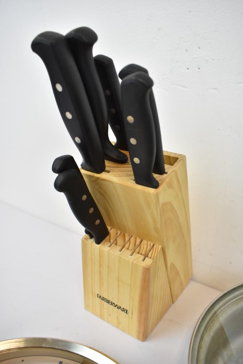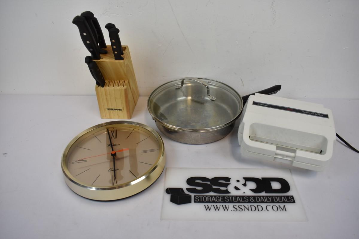 4 pc Home Goods: Knife Block, Sandwich Maker, Pan w/ Lid, & Wall Clock