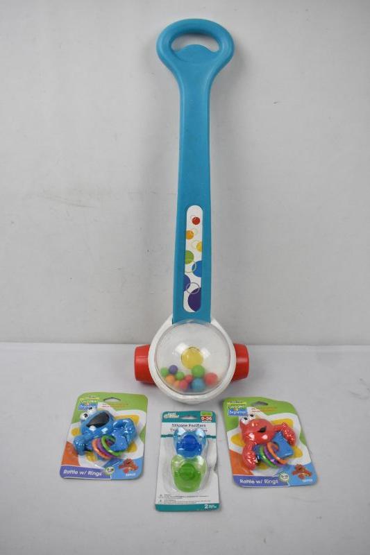 4 Pc Infant/Toddler Toys: Fisher Price Corn Popper, Rattles New, Pacifiers New