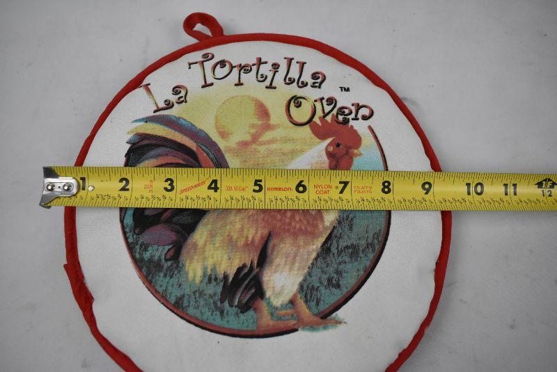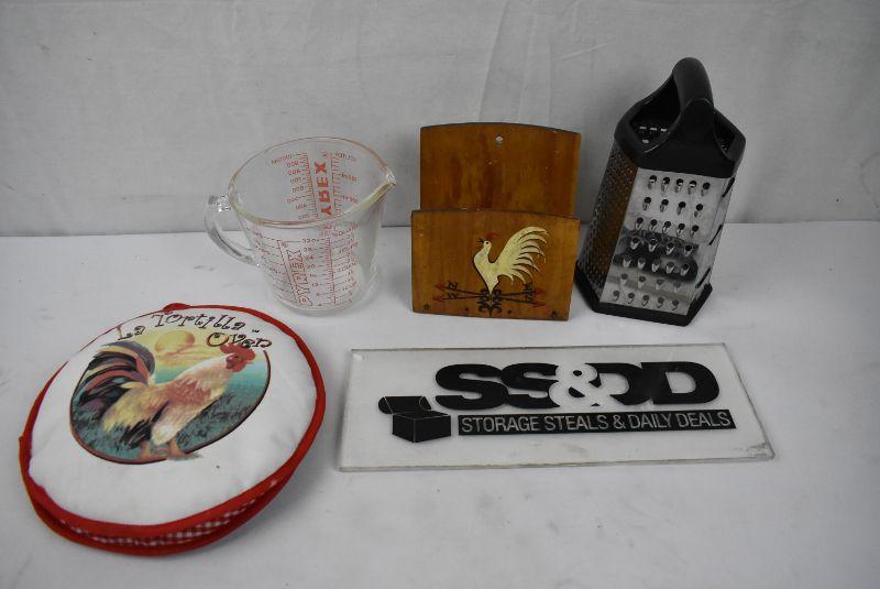 4 pc Kitchen: Rooster Tortilla Oven, Pyrex 4 cup measuring cup, Rooster Wooden Napkin Holder, and Cheese grater