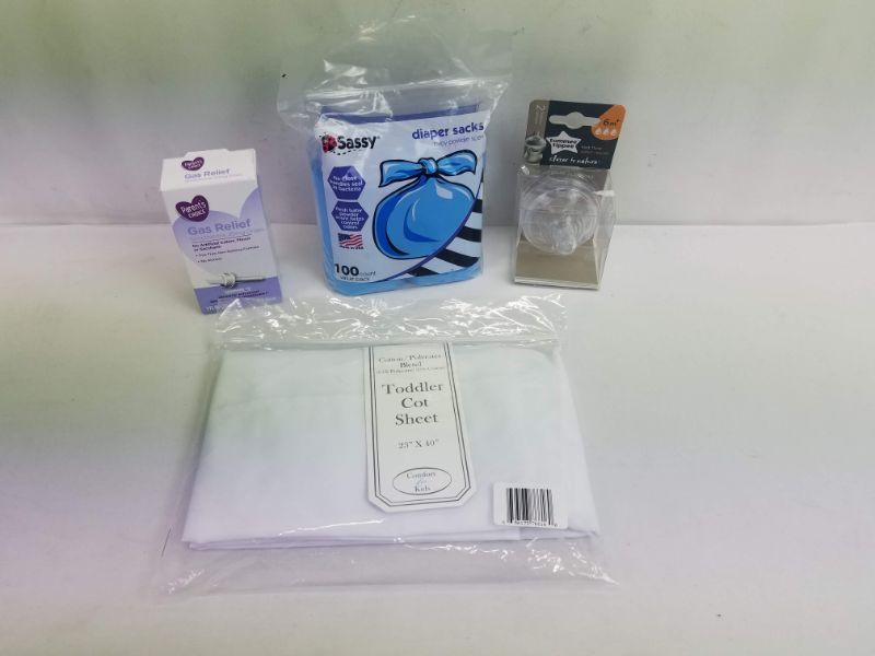 4 pc Misc Baby Items: Diaper Sacks, Bottle Nipples, Cot Sheet, Gas Relief - New