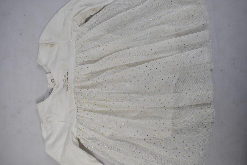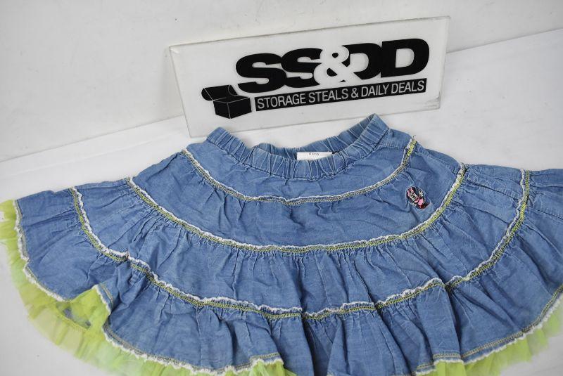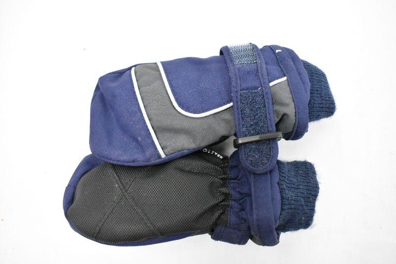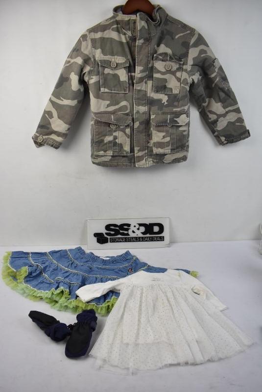 4 pc Misc Kids Clothing Lot: Navy Toddler Gloves, Minnie Mouse Skirt sz Medium, Absorba Dress size 6-9 months, Camo Coat, sz 6/7