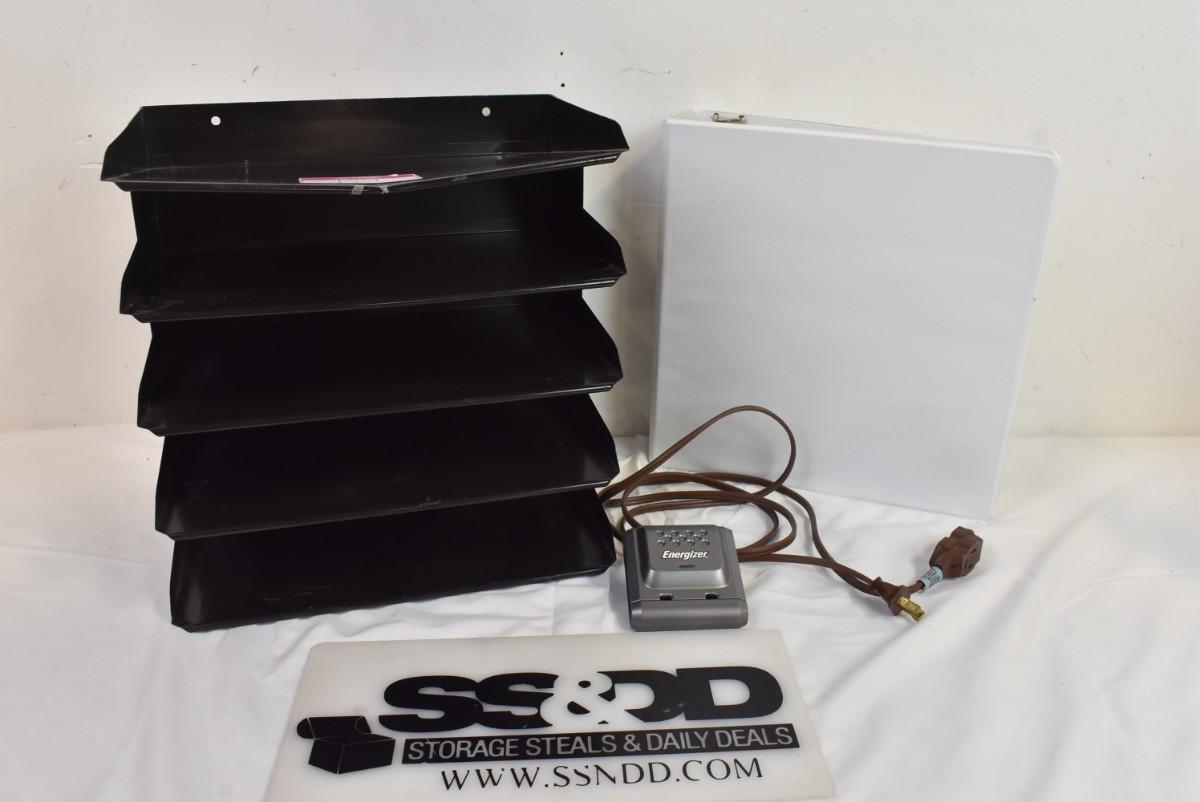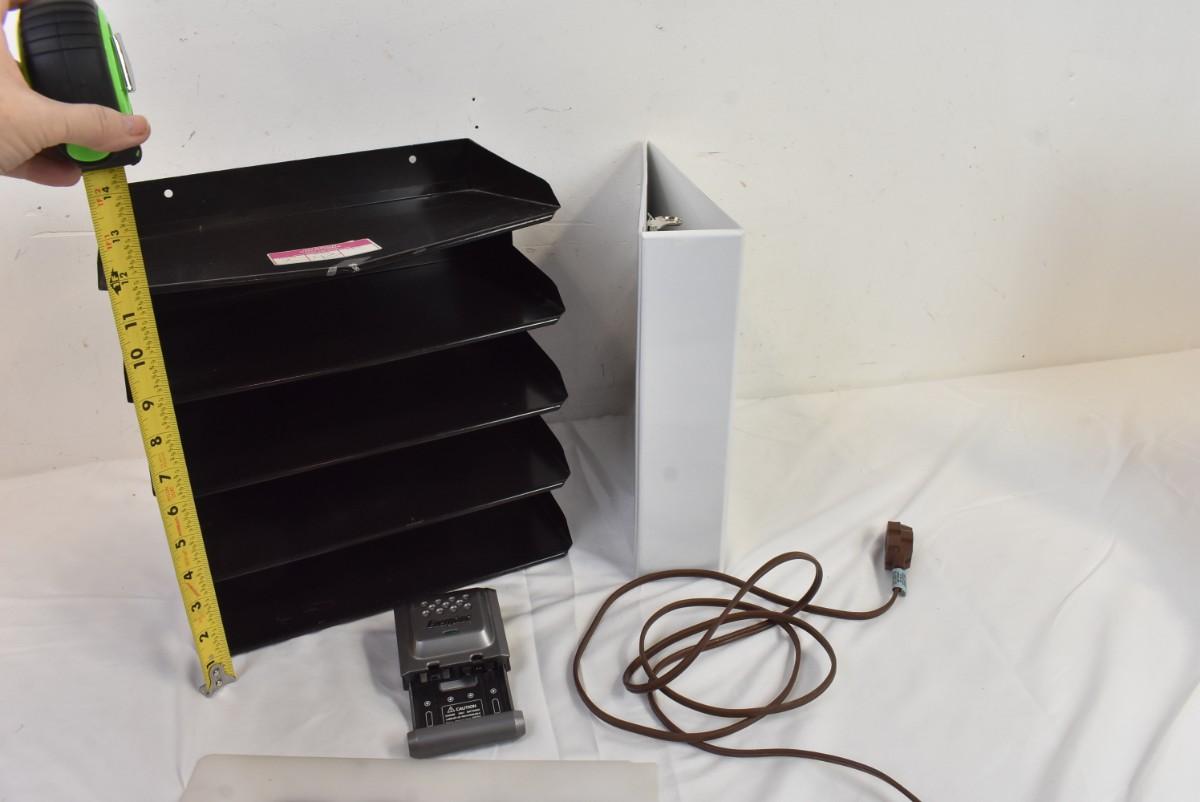 4 pc Office lot: file organizer, Energizer battery recharger, binder, extension cord