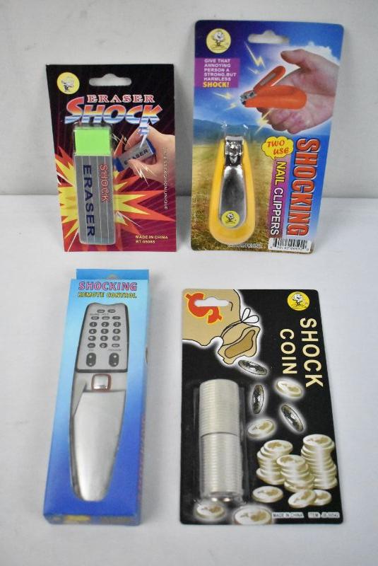 4 Piece Practical Joke Shocking Toys: Eraser, Nail Clippers, Remote, & Coins - New