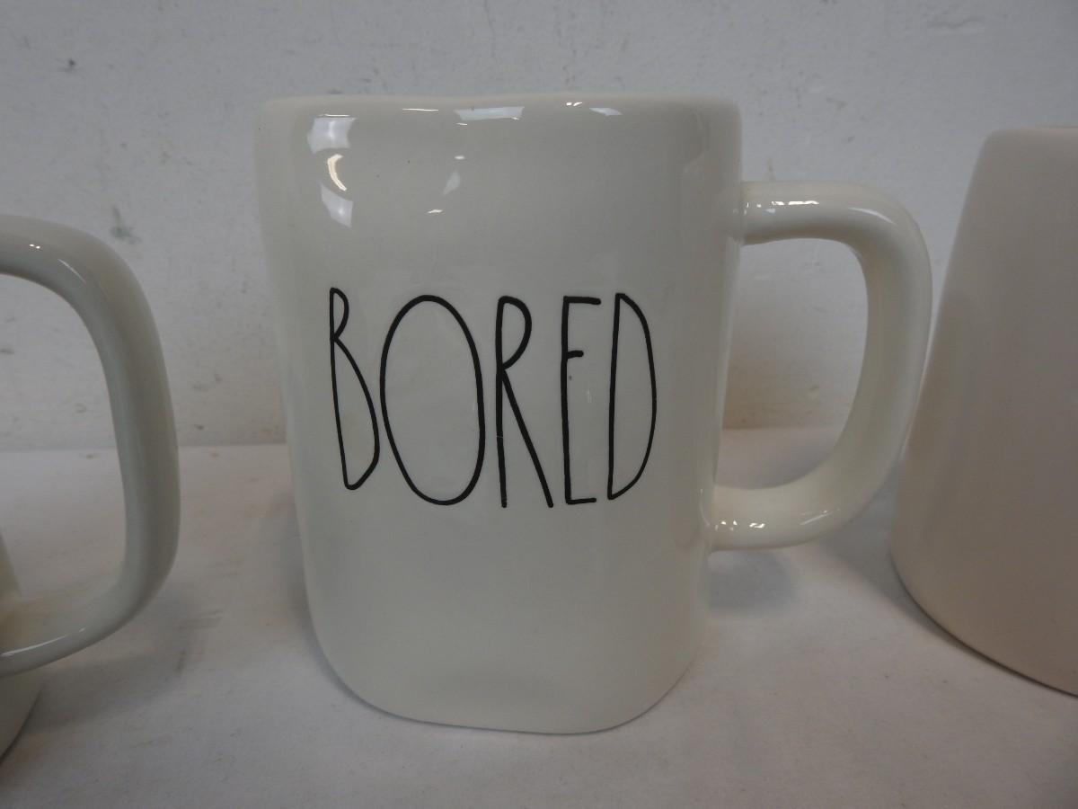 4 pc Rae Dunn, Spatula & Cutter Set, 3 Mugs, Squad, Bored, Be Curious
