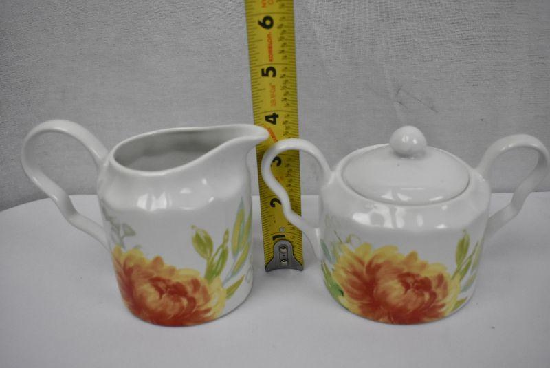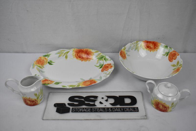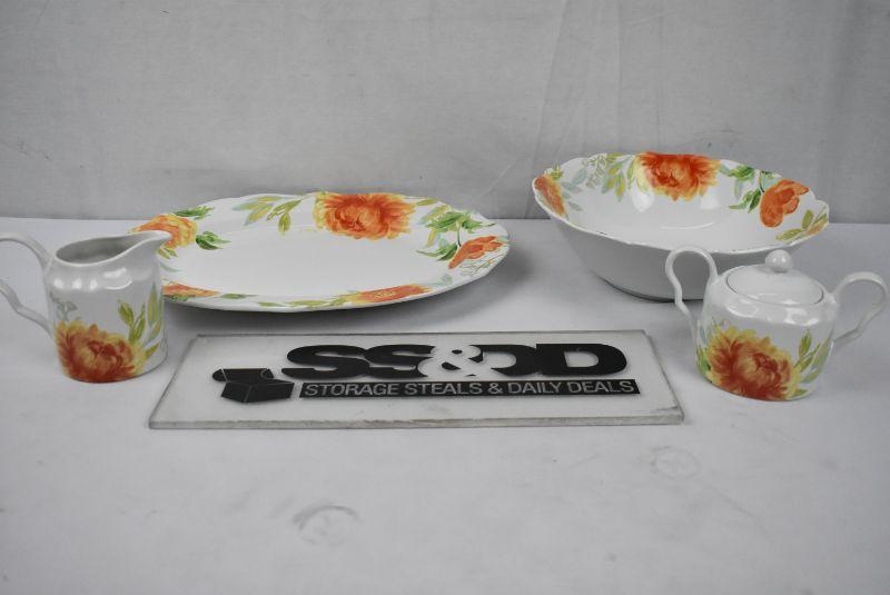 4 pc Serving Ware by 222 Fifth Haverhill: White with Orange & Green Floral: Platter, Bowl, Creamer & Sugar (with lid)