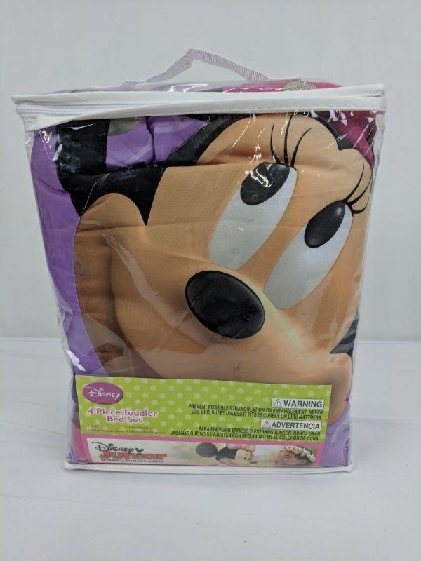 4 PC Toddler Bed Set, Minnie Mouse, 1 Quilt, 1 Fitted Bottom Sheet, 1 Flat Top Sheet, 1 Reversible Pillowcase - New